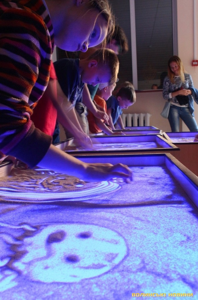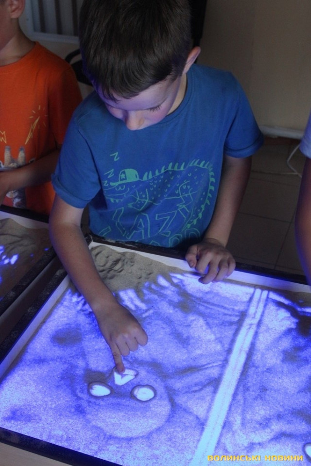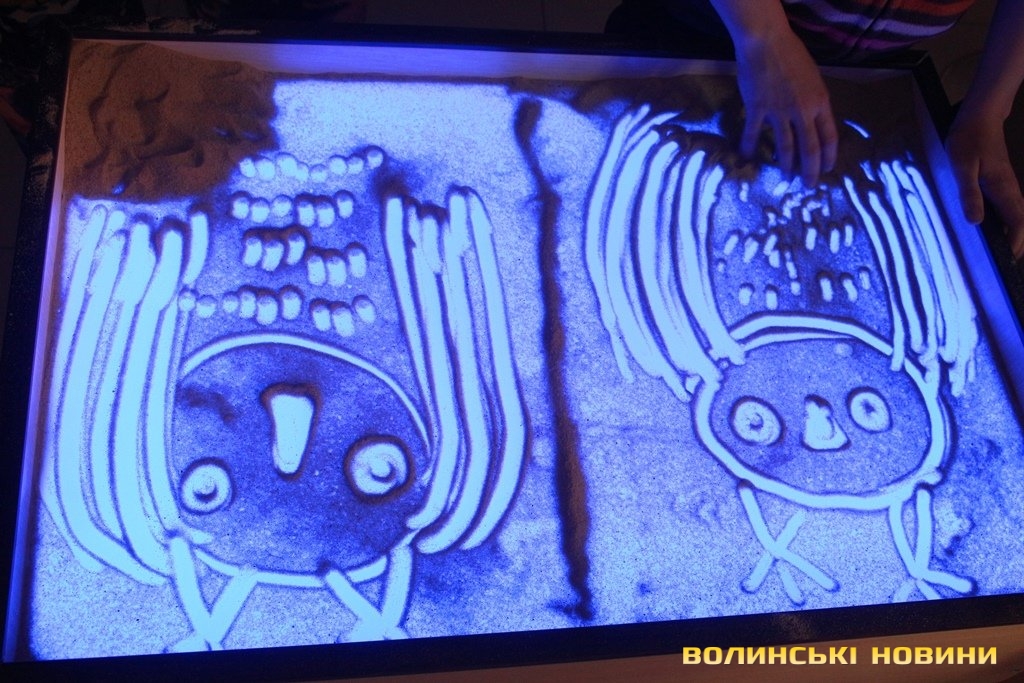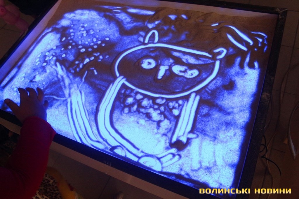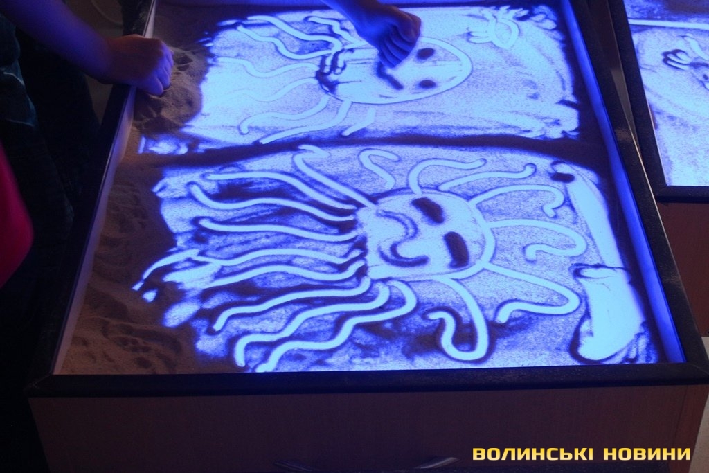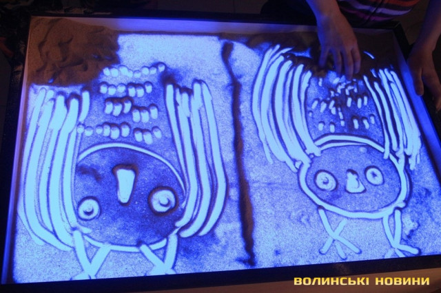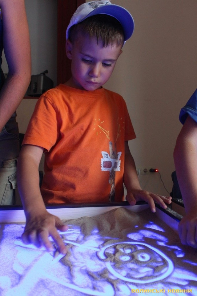 В салоні встановили спеціальні маленькі столики для малювання піском, щоб дітям було зручно. Після кількох спроб зосередити увагу дітлахів, майстер Ірина Мельник почала пояснювати і показувати як же правильно творити картини з піску.