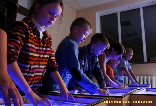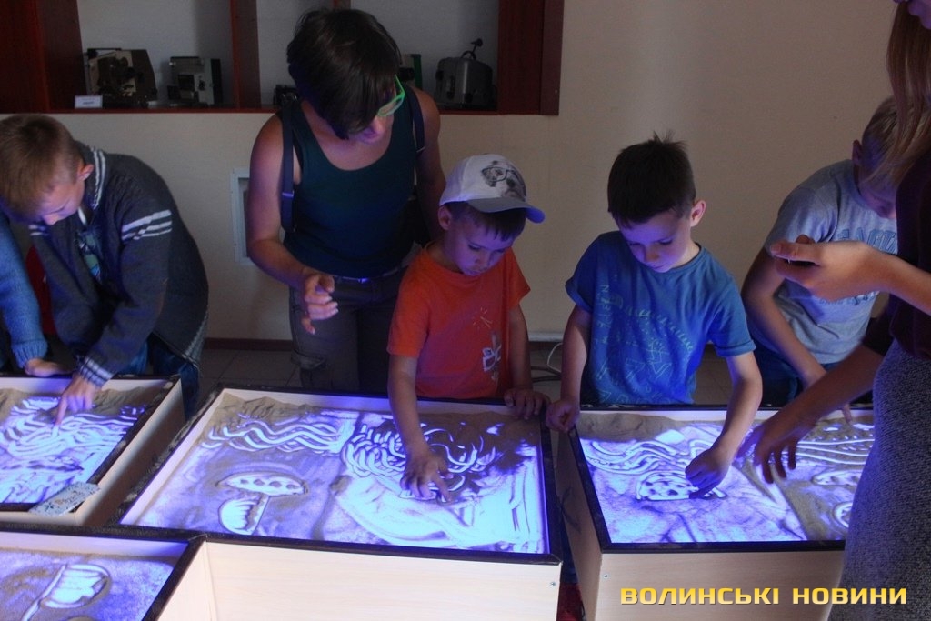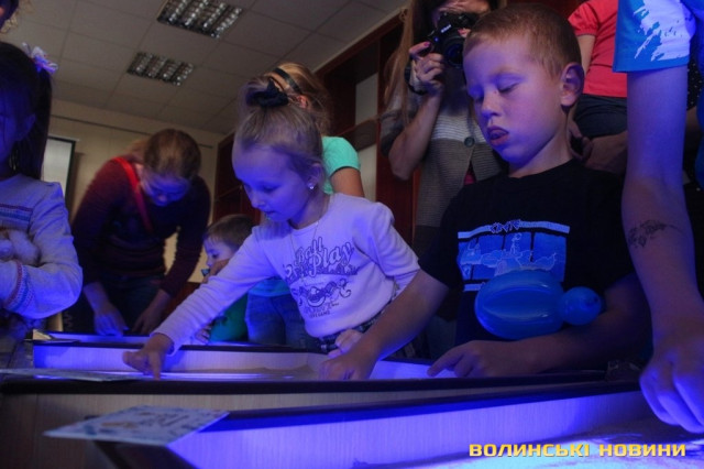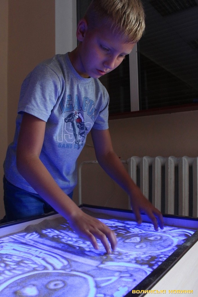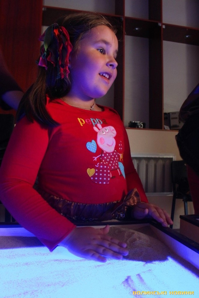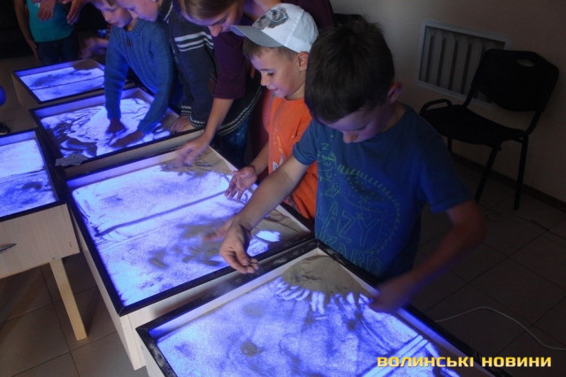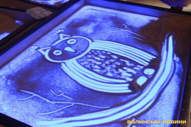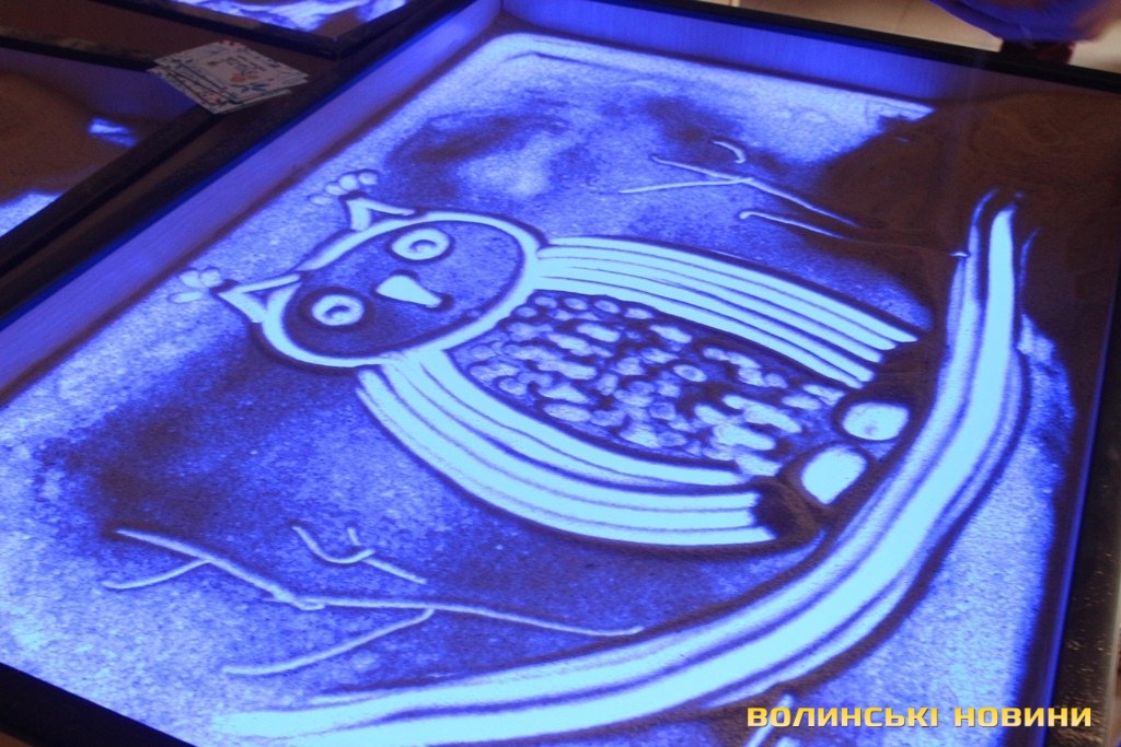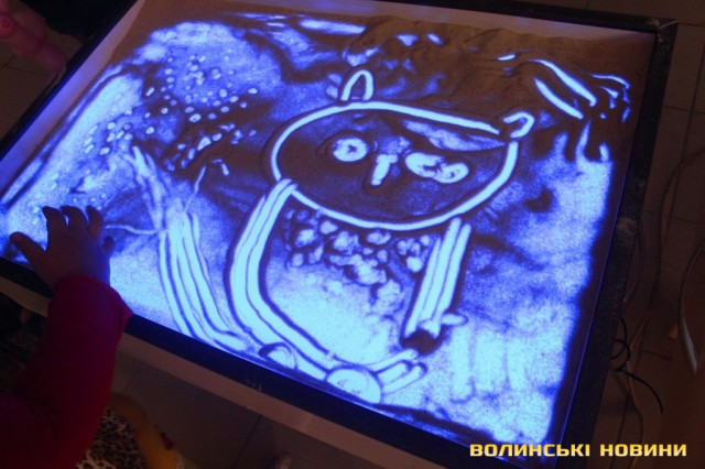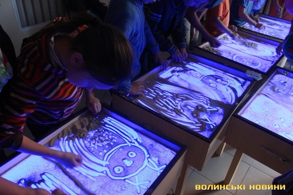 В салоні встановили спеціальні маленькі столики для малювання піском, щоб дітям було зручно. Після кількох спроб зосередити увагу дітлахів, майстер Ірина Мельник почала пояснювати і показувати як же правильно творити картини з піску.