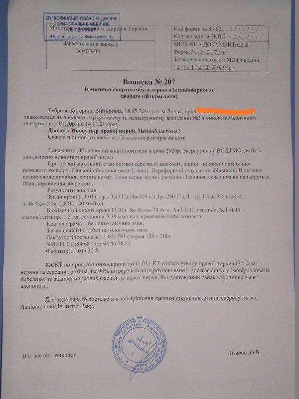 У січні 2020 року дівчинка пройшла обстеження у Волинській обласній дитячій клінічній лікарні (ВОДТМО), куди потрапила зі скаргами на збільшення розмірів живота. Там лікарі повідомили батькам Катрусі про страшний діагноз їхньої донечки – нейробластома ( злоякісна нейроендокринна пухлина правої нирки).