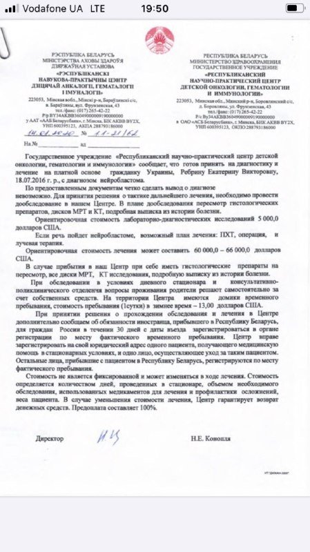 За лікування дівчинки готові взятися спеціалісти із «Республіканського науково-практичного центру дитячої онкології, гематології та імунології» у Білорусі. Лікування нейробластоми у цьому центрі вартуватиме 60-70 тисяч доларів.