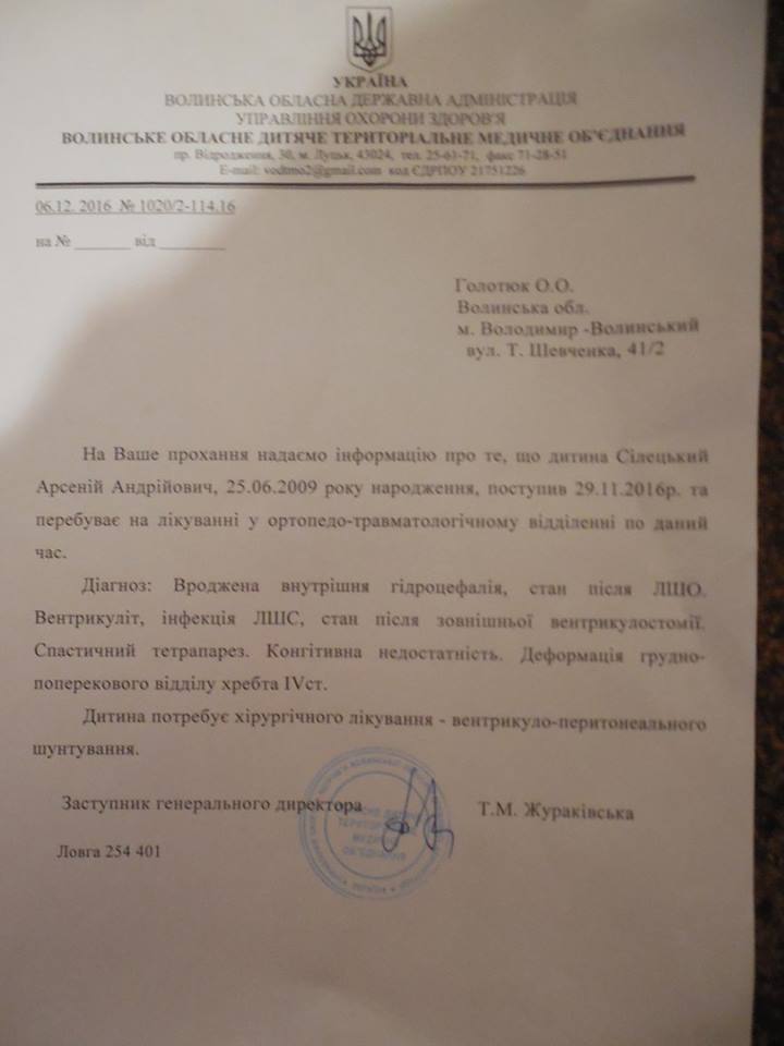 Нині Арсенчик знаходиться у лікарні з діагнозом: вроджена внутрішня гідроцефалія, стан після ЛШО, вертикуліт, інфекція ЛШС, стан післязовнішньої вентрикулостомії, спастичний тетрапарез, когнітивна недостатність, деформація грудно-поперекового відділу хребта IVступення.