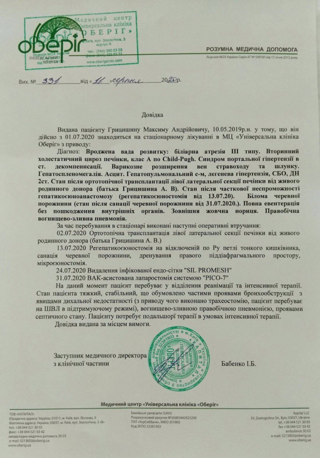 При народження хлопчику поставили цілий «букет» страшних діагнозів: міліарна атрезія, цироз печінки, синдром портальної гіпертензії в стадії декомпенсації, варикозне розширення вен стравоходу ІІІ ступеня, гіперспленізм ІІ ступеня, хронічна печінкова недостатність, хронічна енцифалопатія. Він потребував трансплантації печінки. На щастя батько Андрій підійшов, як донор, тож у січні 2020 року батьки звернулися по допомогу до небайдужих з проханням фінансової допомоги. Спільними зусиллями вдалося зібрати кошти.