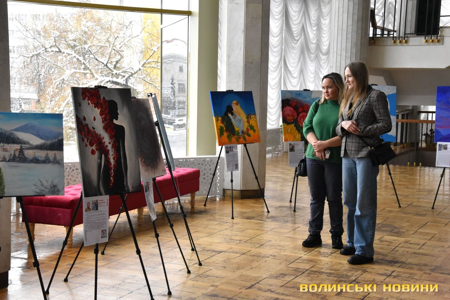 У Луцьку відбулося відкриття виставки картин «Малюю серцем», написаних дружинами загиблих у російсько-українській війні Героїв. Роботи розмістили в холі Волинського обласного академічного музично-драматичного театру імені Тараса Шевченка.