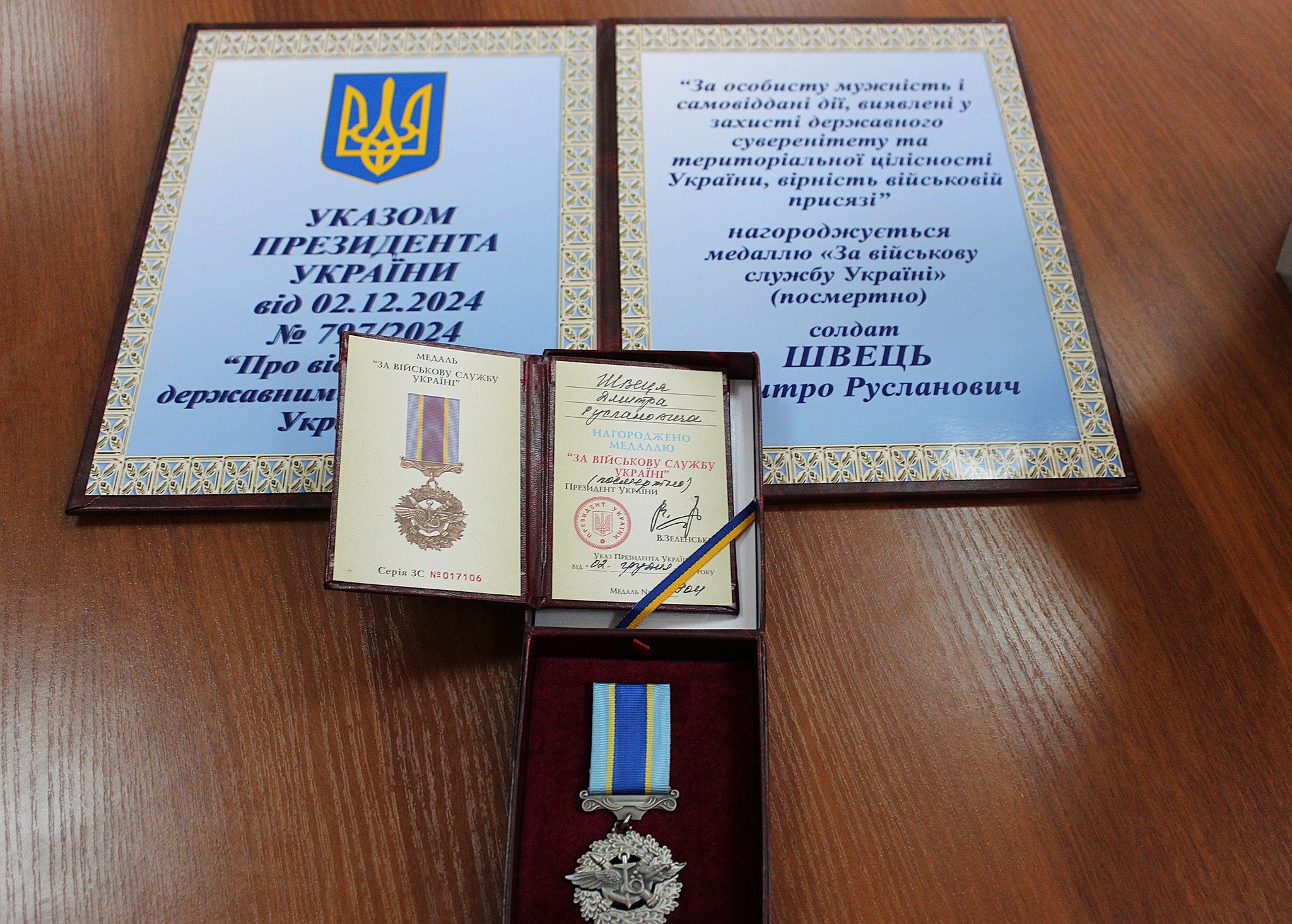 За особисту мужність, виявлену в захисті державного суверенітету та територіальної цілісності України, самовіддане служіння Українському народові, відповідно до указу Президента №797/2024 медаллю «За військову службу Україні» посмертно нагородили Дмитра Руслановича Швеця 2002 року народження із села Олешковичі Луцького району.
