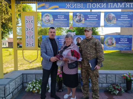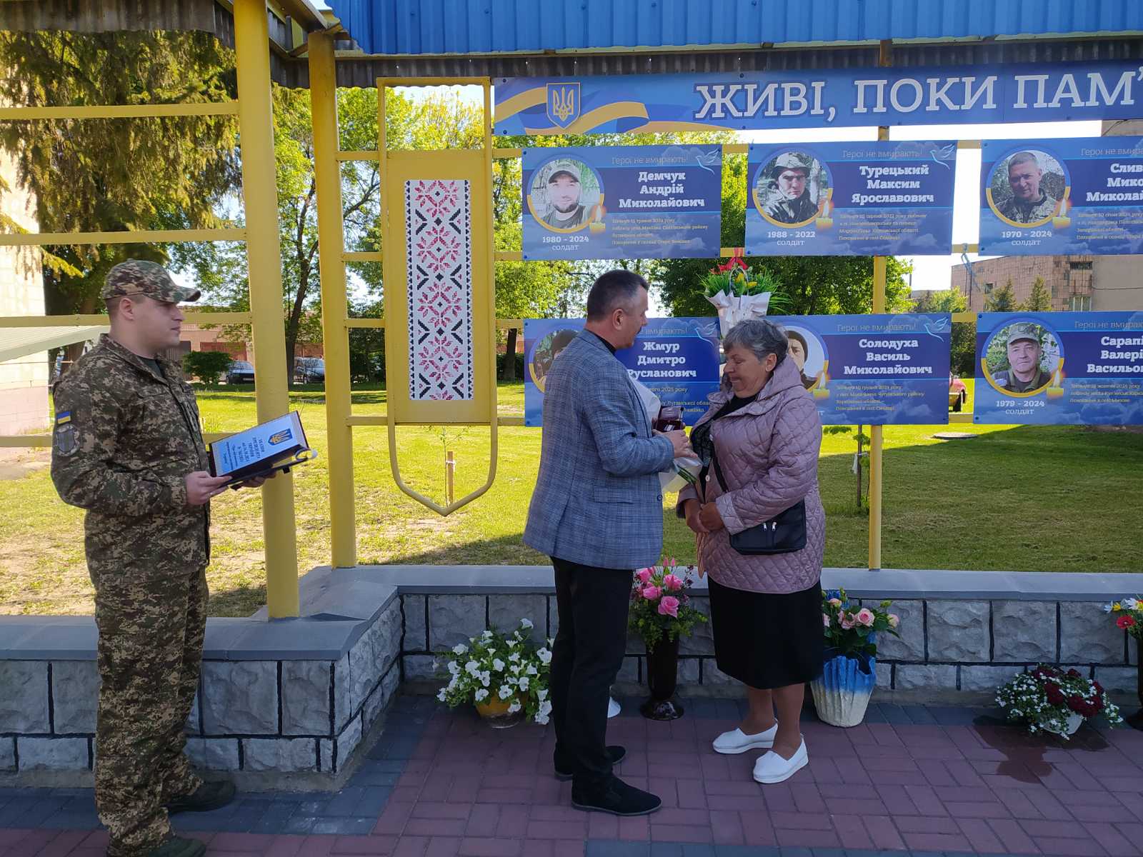 Нагороду з рук селищного голови Василя Камінського та т. в. о. заступника військової частини 1141 Національної гвардії України із роботи з особовим складом Віталія Пліска отримала мама загиблого Героя Катерина Демчук.