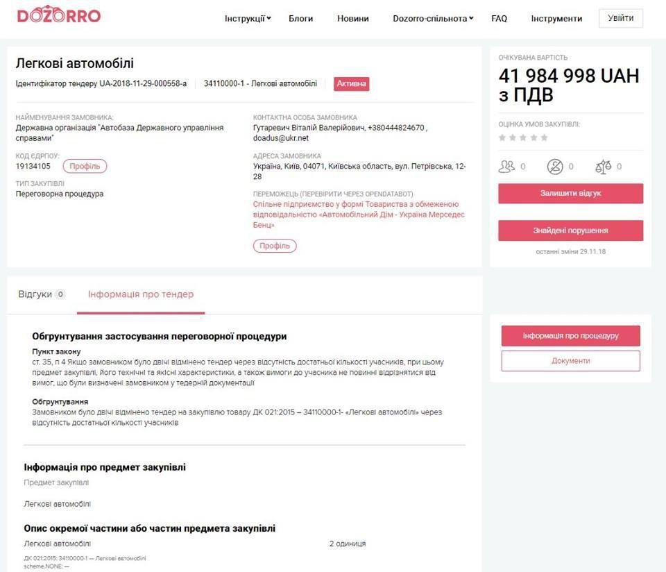 І, дійсно, вже за два місяці Держуправління справами оголосило нову закупівлю - по так званій переговорній процедурі. При цьому для переговорів запросили не компанію Євгена, яка пропонувала дешевші у півтора рази автомобілі, а «Автомобільний Дім – Україна Мерседес Бенц». Їх ціна була копійка в копійку як та, яку виставили чиновники. Економія – жодної гривні.