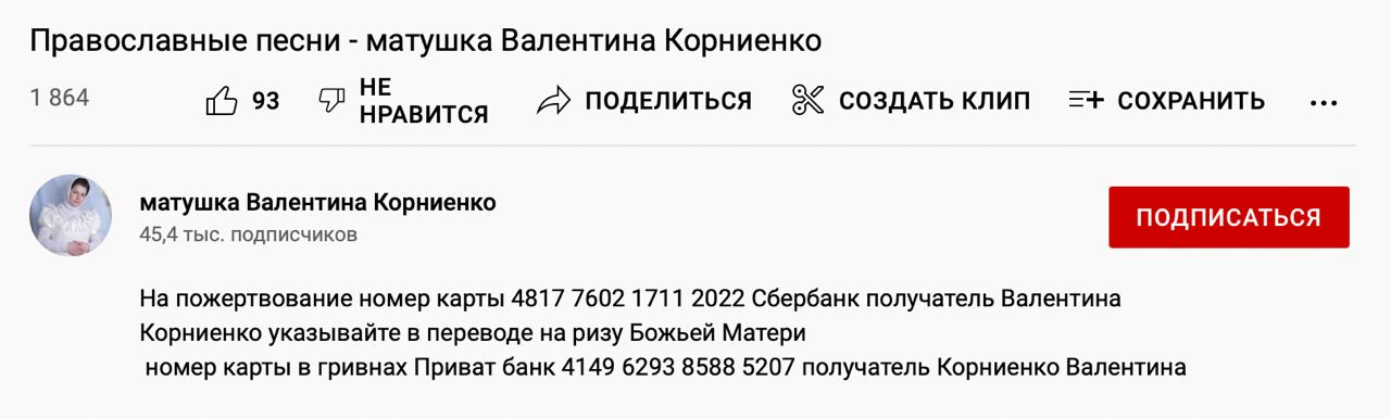 Під деякими роликами Валентина Корнієнко збирає пожертви (як вказує, на ризу Божої Матері). В описі зазначає також реквізити для переказування коштів у гривнях.