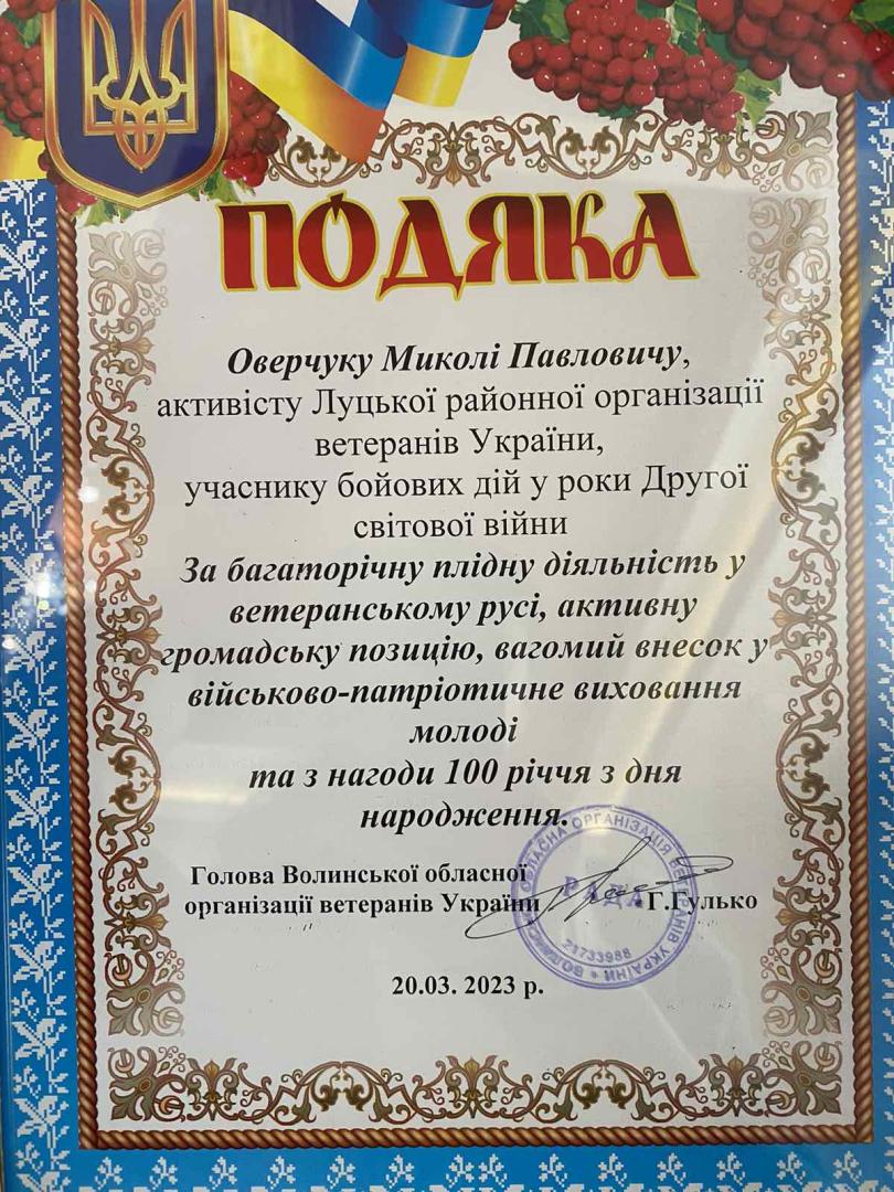 Від імені Волинської обласної організації ветеранів Микола Павлович отримав подяку за багаторічну, плідну діяльність у ветеранському русі, активну життєву позицію та вагомий внесок у військово-патріотичне виховання молоді.