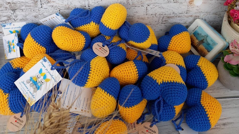 Нещодавно майстриня передала 30 жовто-блакитних сердець та 20 зайчат у Бельгію.Також в’язала іграшки у Німеччину та США. Каже, що волонтери, які збирають допомогу для України за кордоном, дарують її в’язані іграшки благодійникам, які їм допомагають.
