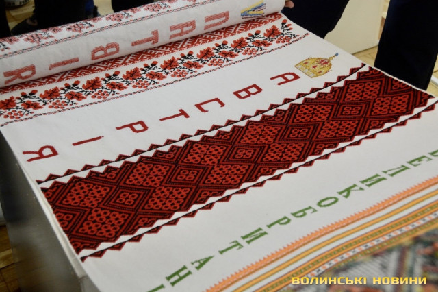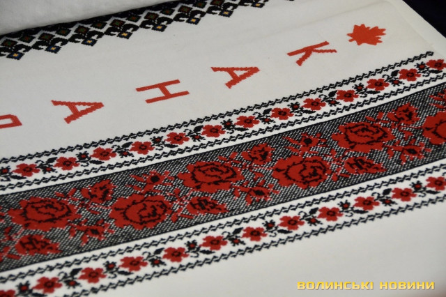 Майстриня з Луцька вишила на міжнародному рушнику єднання столітній волинський візерунок. Фото
