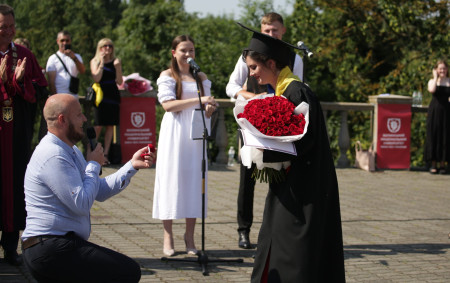 Щемливим моментом стало заручення закоханої пари перед університетською спільнотою. Чоловік вирішив зробити пропозицію своїй обраниці після отримання нею диплома.