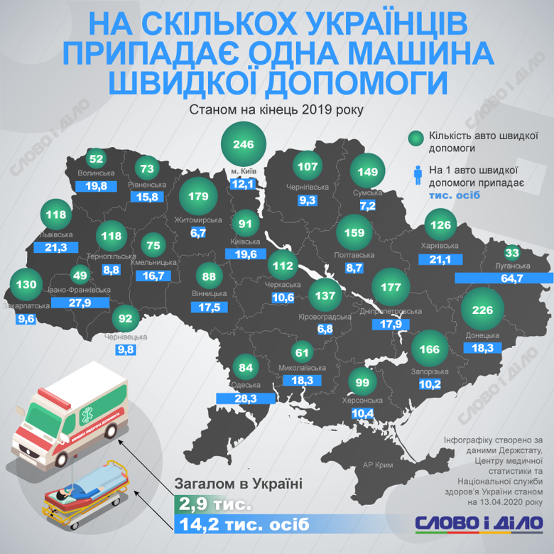На одне авто швидкої допомоги припадає 14 тисяч 211 українців.