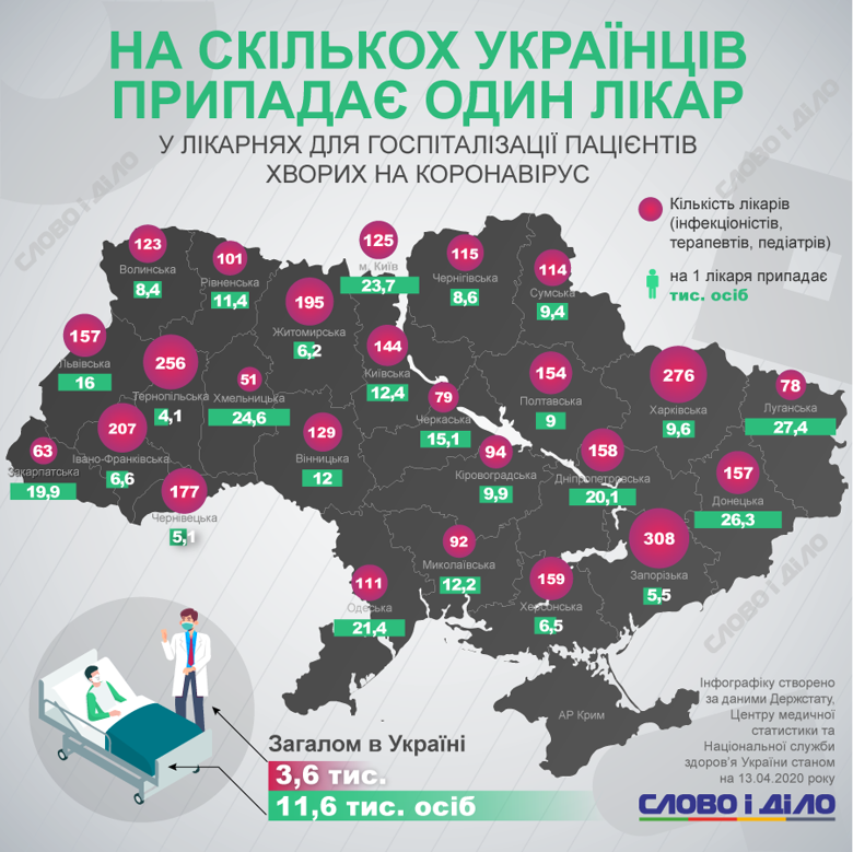 Загалом в Україні 3 тис. 623 лікарі (інфекціоністи, терапевти, педіатри). На одного медичного спеціаліста припадає 11 тис. 600 потенційних пацієнтів.
