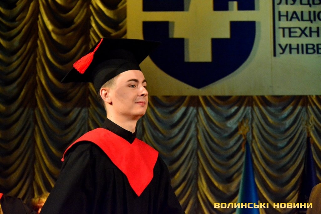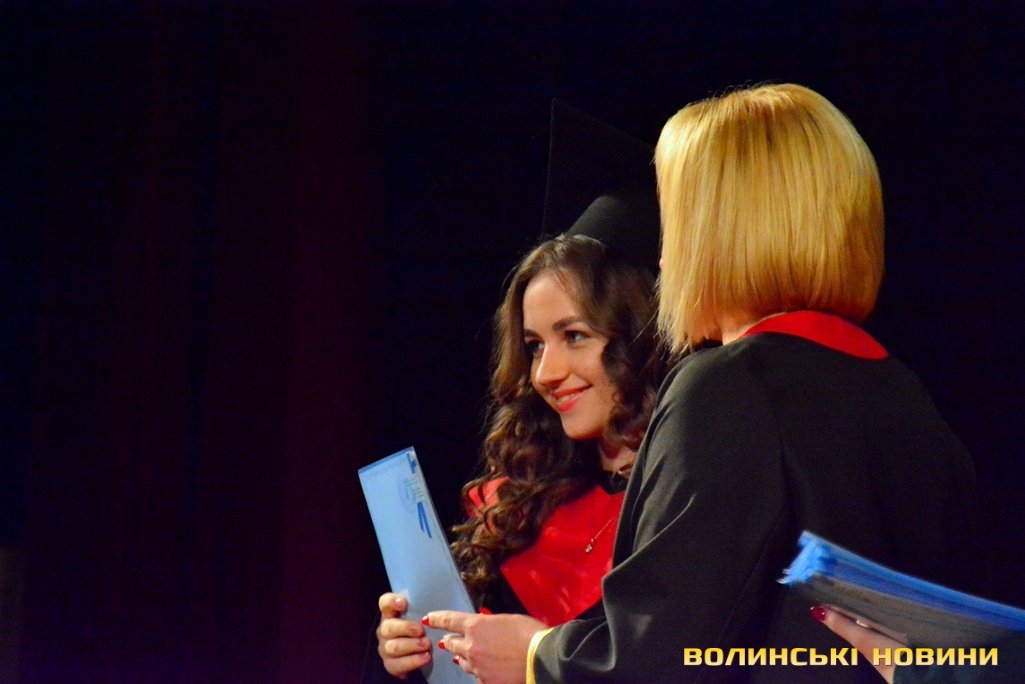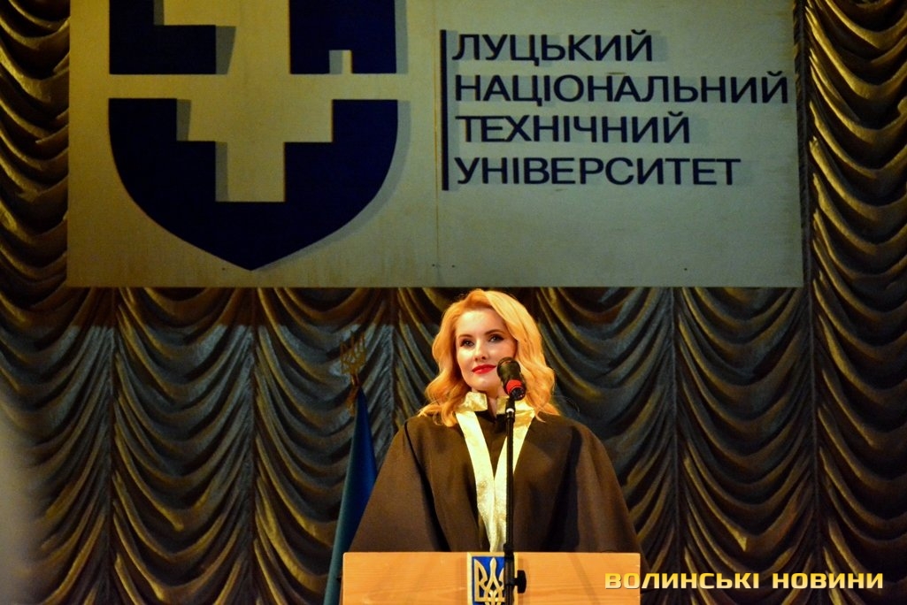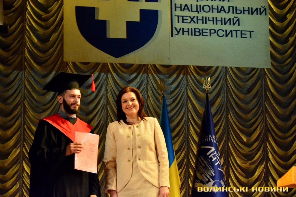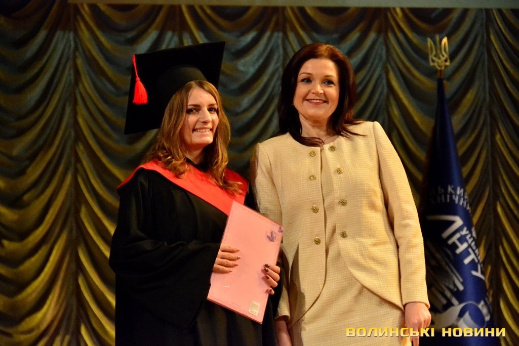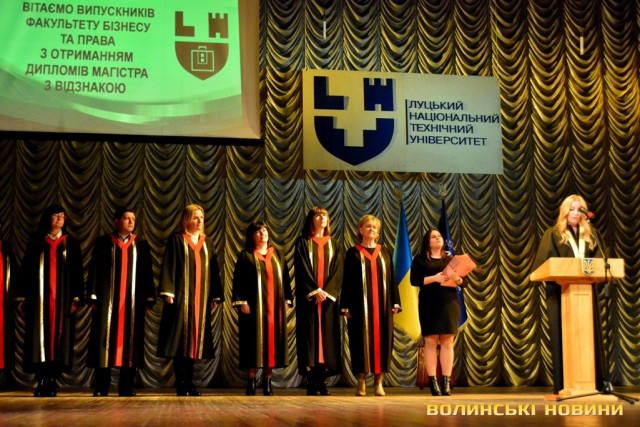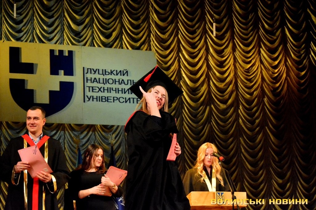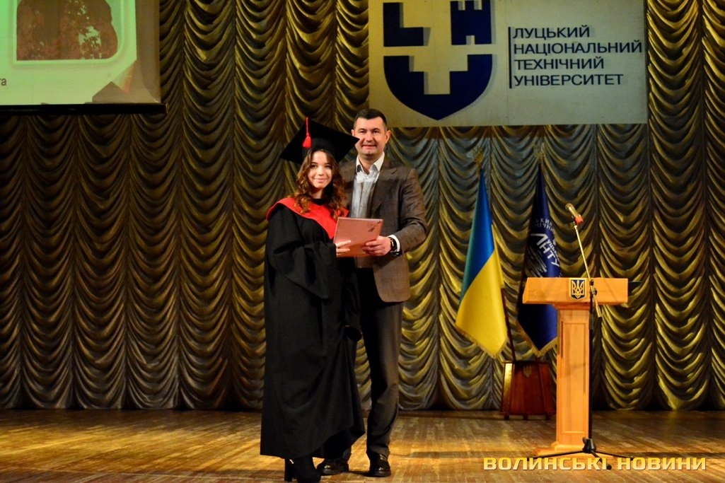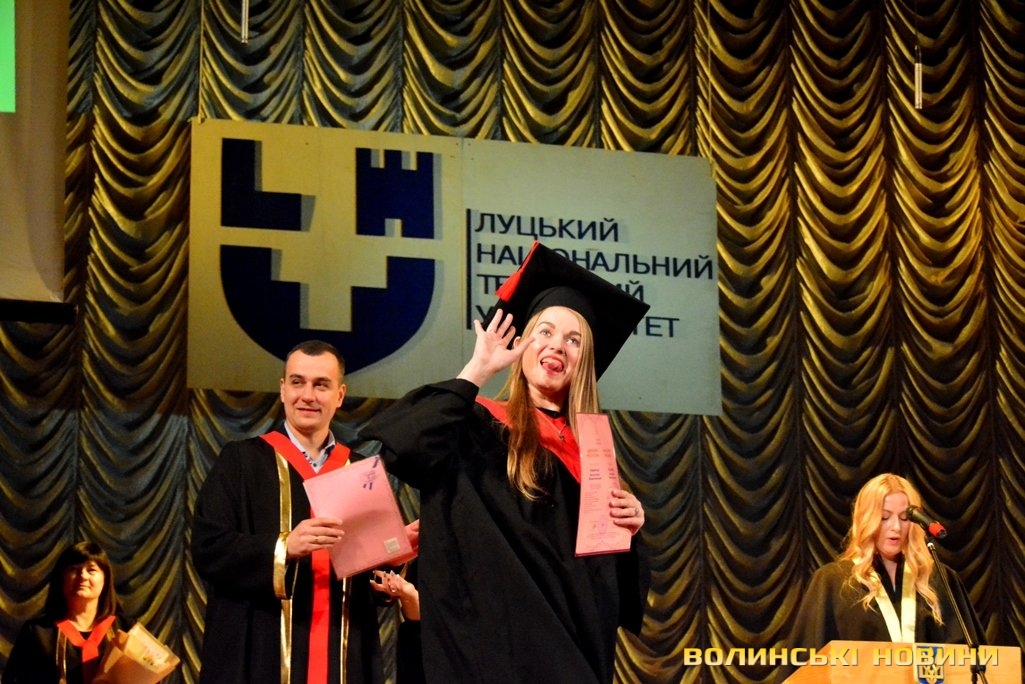 Нарешті настав день, якого очікували усі випускники одного з найбільших університетів Волині. На початку дійства до зали запросили керівництво «політеху». Випускників-магістрів вітали керівництво університету, представники міської та обласної влади та духовенство.Ректор університету Ірина Вахович у вітальному слові для випускників відзначила, що сьогодні вони змінюють свій статус: «Це історичний для вас день. Я щиро вас вітаю з цим. Бажаю нашим випускникам розвитку та процвітання. Кожна людина є інвестором. Вона інвестує свої ресурси, свій час, свій потенціал для створення певного блага. Протягом навчання наш колектив інвестував у вас, далі ви стаєте на шлях самостійного життя. Я хочу, щоб ви усвідомили, що знання можна охопити, навчаючись протягом усього життя. Закликаю вас щодня витрачати годину на саморозвиток, щоб ви стали професійними».Митрополит Луцький та Волинський Михаїл наголосив, що наступний крок для випускників – доросле життя, тому, окрім РАГСу, він запросив на вінчання у собор та пожартував, що для першого випускника, в якого буде дитина, хрещення буде безкоштовне. Владика закликав на усіх Боже благословення та побажав щасливої доліГолова Волинської обласної ради Григорій Недопад також відзначив, що навчатися потрібно потягом усього життя, тому не потрібно боятися знову повертатися до університету та навчатися чомусь новому.Заступниця Луцького міського голови Ірина Чебелюк сказала, що сьогодні свято не лише для випускників, а й для викладачів, бо вони можуть оцінити той шлях, який пройшли їхні студенти. Вона побажала випускникам, щоб їм відкривалися нові висоти.Після усіх привітань, декани нарешті почали вручати дипломи магістрів студентам, більшість з яких йшли до них понад п‘ять років.