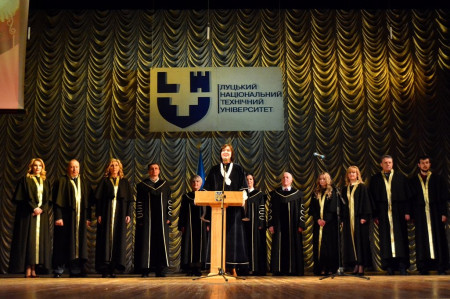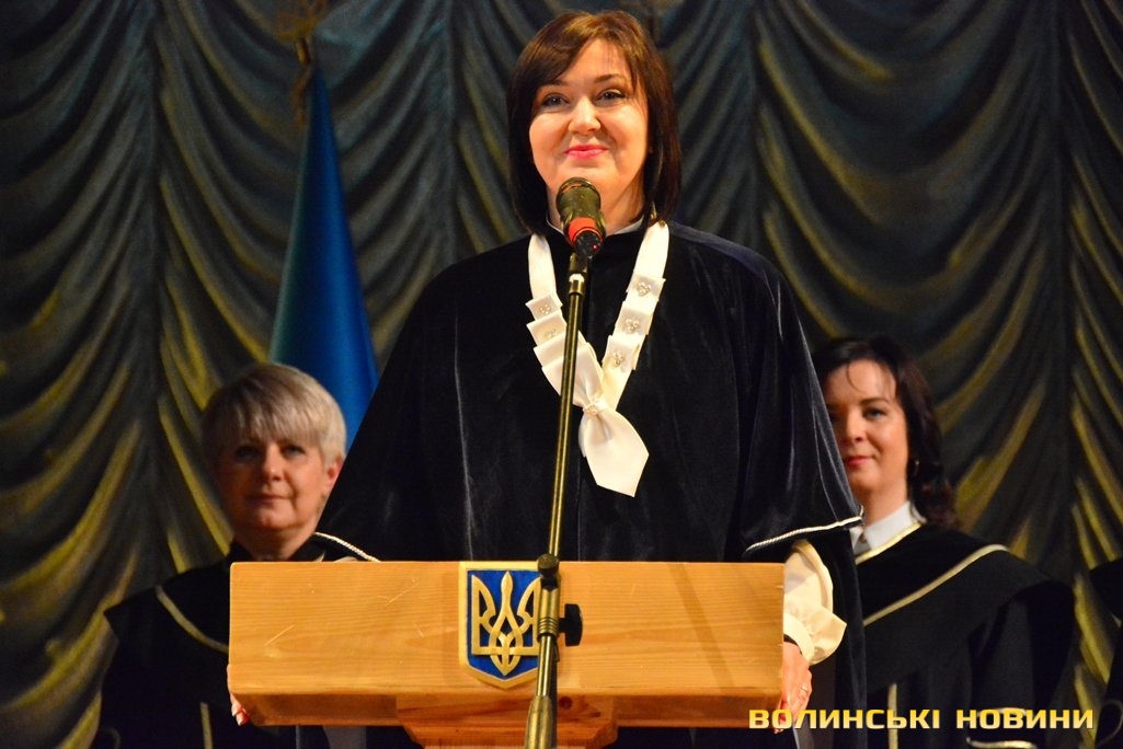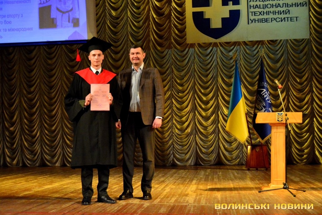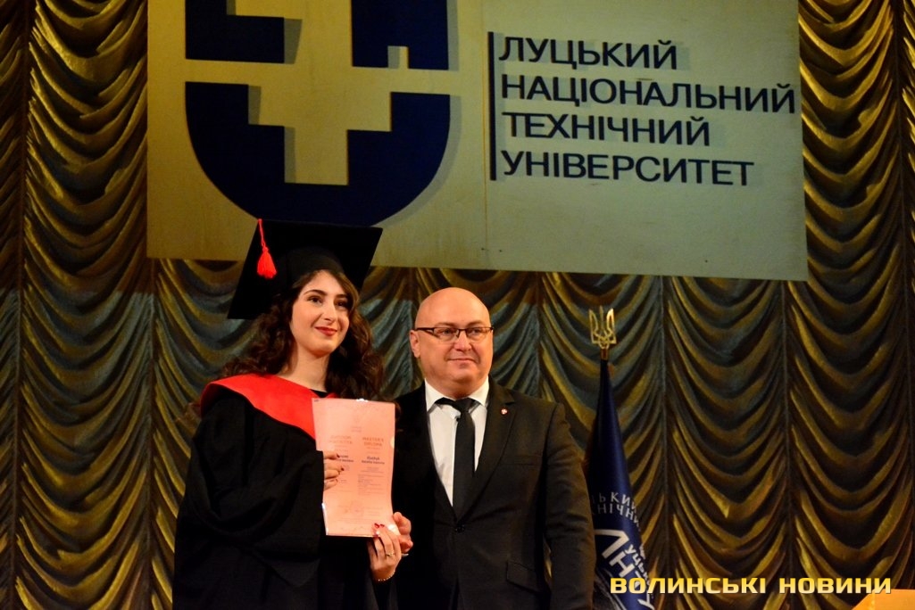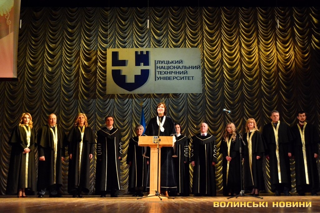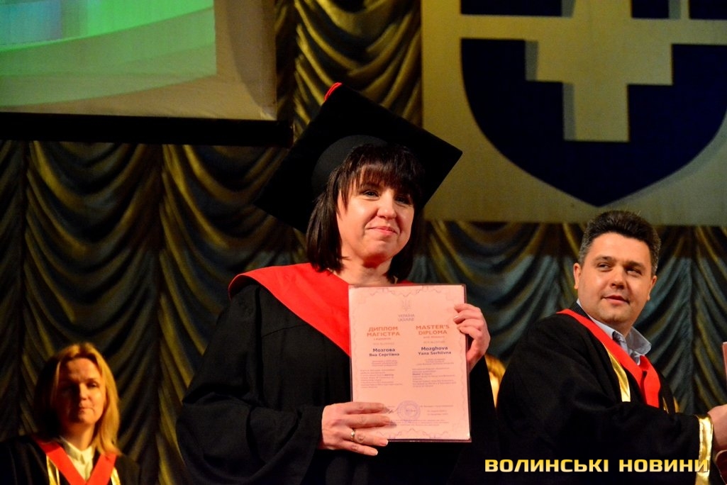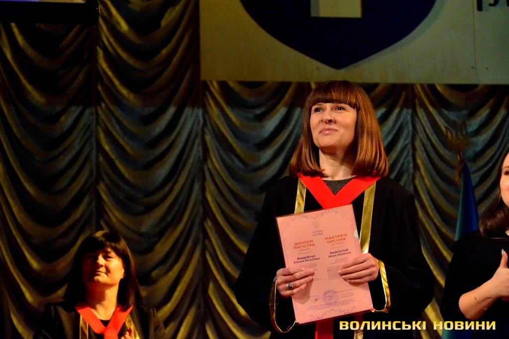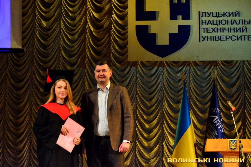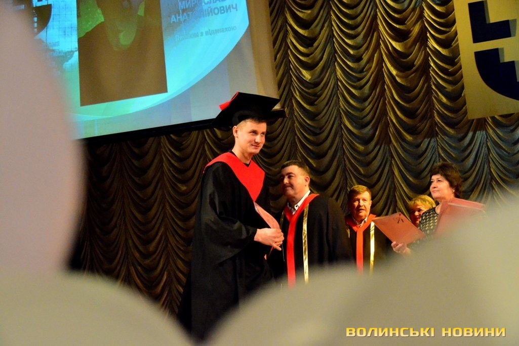 Нарешті настав день, якого очікували усі випускники одного з найбільших університетів Волині. На початку дійства до зали запросили керівництво «політеху». Випускників-магістрів вітали керівництво університету, представники міської та обласної влади та духовенство.Ректор університету Ірина Вахович у вітальному слові для випускників відзначила, що сьогодні вони змінюють свій статус: «Це історичний для вас день. Я щиро вас вітаю з цим. Бажаю нашим випускникам розвитку та процвітання. Кожна людина є інвестором. Вона інвестує свої ресурси, свій час, свій потенціал для створення певного блага. Протягом навчання наш колектив інвестував у вас, далі ви стаєте на шлях самостійного життя. Я хочу, щоб ви усвідомили, що знання можна охопити, навчаючись протягом усього життя. Закликаю вас щодня витрачати годину на саморозвиток, щоб ви стали професійними».Митрополит Луцький та Волинський Михаїл наголосив, що наступний крок для випускників – доросле життя, тому, окрім РАГСу, він запросив на вінчання у собор та пожартував, що для першого випускника, в якого буде дитина, хрещення буде безкоштовне. Владика закликав на усіх Боже благословення та побажав щасливої доліГолова Волинської обласної ради Григорій Недопад також відзначив, що навчатися потрібно потягом усього життя, тому не потрібно боятися знову повертатися до університету та навчатися чомусь новому.Заступниця Луцького міського голови Ірина Чебелюк сказала, що сьогодні свято не лише для випускників, а й для викладачів, бо вони можуть оцінити той шлях, який пройшли їхні студенти. Вона побажала випускникам, щоб їм відкривалися нові висоти.Після усіх привітань, декани нарешті почали вручати дипломи магістрів студентам, більшість з яких йшли до них понад п‘ять років.