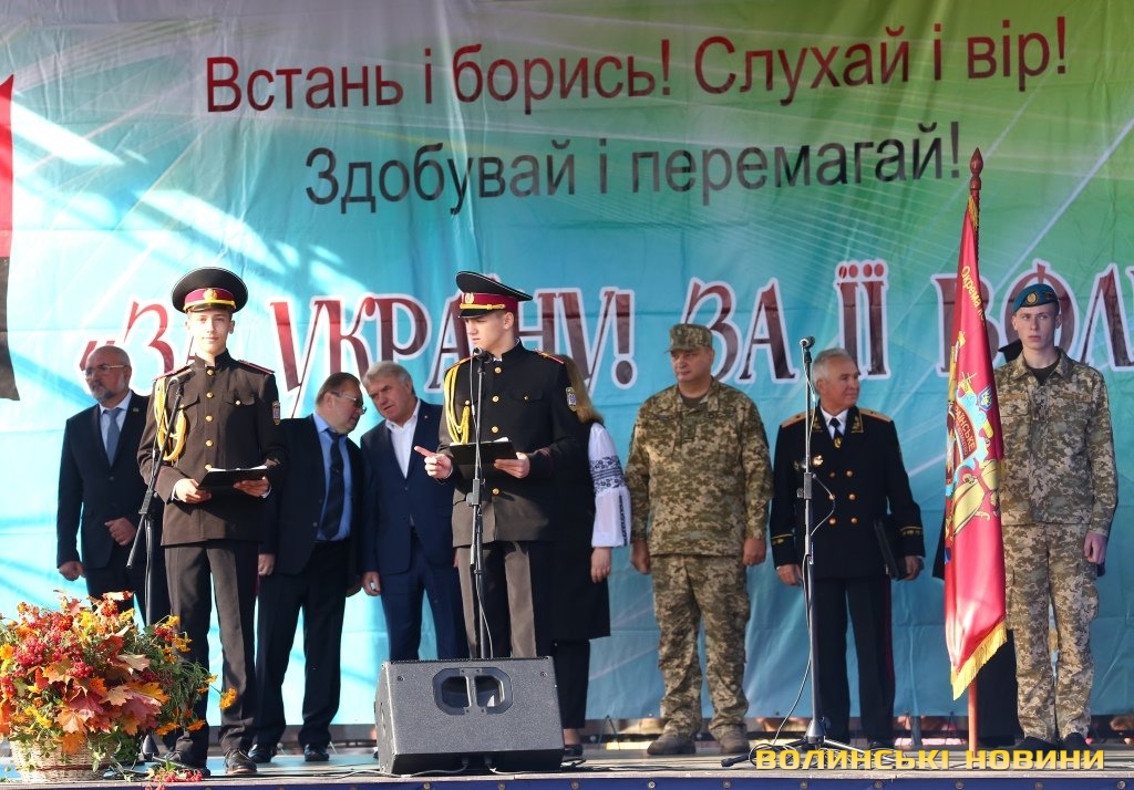 Заступник голови Волинської облради Роман Карпюк передав вітання від голови обласної ради та депутатського корпусу та побажав їм з честю нести звання захисника вітчизни, жити у мирній країні. Виконувач повноважень Луцького міського голови Григорій Пустовіт, вітаючи юних вихованців ліцею, відзначив, що вони стали на складний, але гідний шлях, шлях воїна-захисника України. На цьому шляху на них чекатимуть труднощі та перешкоди, але вони повинні пам’ятати, що не знають слова «не можу».