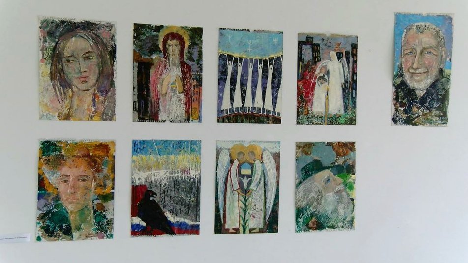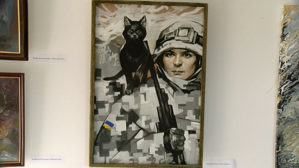Як розповіла Суспільному художниця Оксана Ядчук-Мачинська, у роботах переважає теми війни, що триває в Україні понад вісім років.