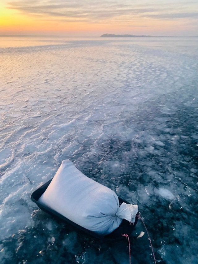 Вода навколо птахів перетворилась на кригу, а знесилені птахи плавали на маленькому водяному плесі.