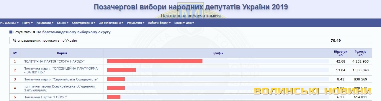 Згідно з даними національного екзит-полу, голоси виборців розподілилися наступним чином: «Слуга народу» – 44,2% , «Опозиційна платформа – За життя» – 11,4%, «Європейська Солідарність» – 8,8%, Всеукраїнське об’єднання «Батьківщина» – 7,4% «Голос» – 6,5%. Пропорційно до такої кількості голосів місця в парламенті можуть розподілитися наступним чином (з 225 всього, передбачених пропорційною системою): «Слуга народу» – 128, «ОПЗЖ» м 33, «Європейська Солідарність» – 25, «Батьківщина» – 21, «Голос» – 18.Попри те, що партія «Слуга народу» отримає відчутну більшість крісел у парламенті, там буде лише один волинянин – керівник волинського штабу партії Валерій Стернійчук. Народився 18 червня 1981 року. Має вищу освіту, завідувач клубу Підгайцівської сільської ради Луцького району. Член партії «Слуга народу». Проживає в місті Луцьку. Включений до виборчого списку під № 46, тож його номер прохідний.