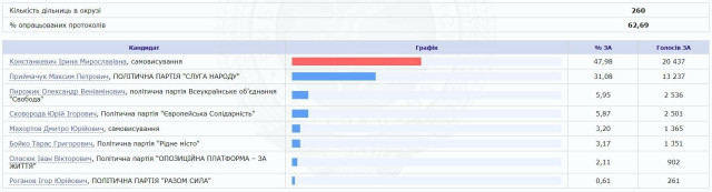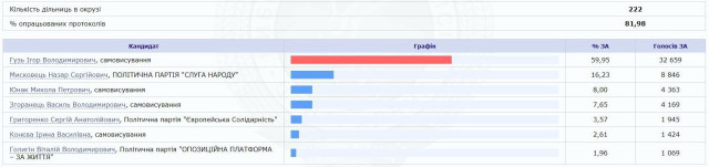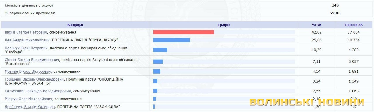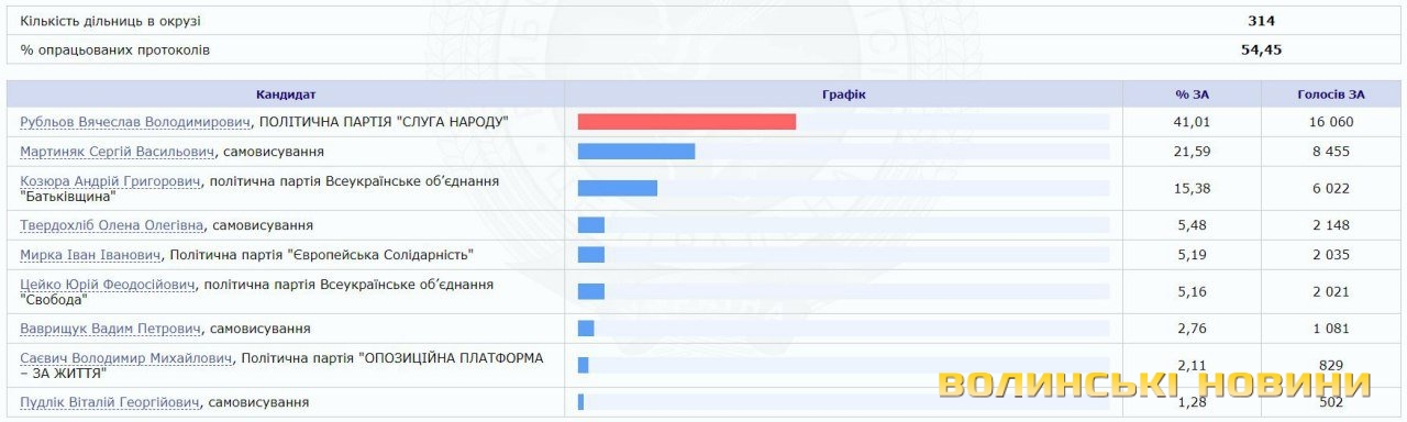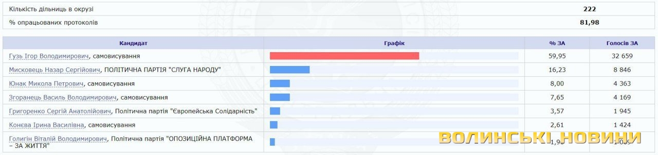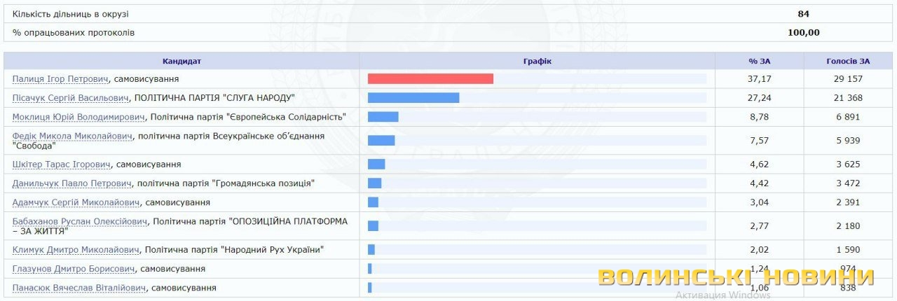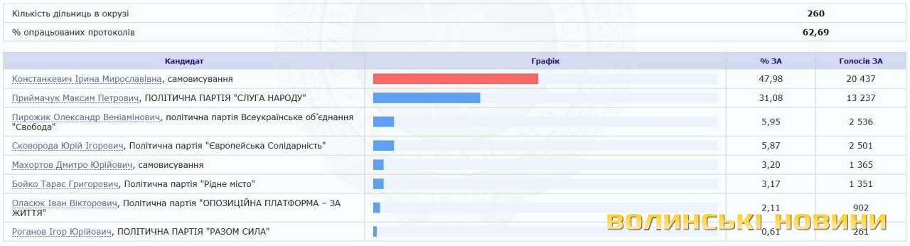 Отже, згідно з попередніми даними ЦВК, на 19 окрузі впевнено перемагає чинний нардеп, самовисуванець Ігор Гузь з результатом 60,14 %. Представник партії «Слуга Народу» Назар Мисковець має лише 16,12%, а на третьому місці – самовисуванець Микола Юнак з результатом 7,8%. До слова, згідно з паралельним підрахунком голосів, Ігор Гузь набрав 58,51% голосів.А ось 20 округ попрощався зі своїм багаторічним нардепом – Сергієм Мартиняком. Його впевнено переміг кандидат від партії «Слуга Народу», депутат Волинської облради Вячеслав Рубльов, за якого віддали 41,11% голосів виборців, які прийшли на дільниці. Сергій Мартиняк отримав лише 21,59%. А депутат Луцької міськради, кандидат від ВО «Батьківщина» Андрій Козюра отримав 15,38% голосів.21 округ у Верховній Раді, згідно з попередніми даними, знову представлятиме самовисуванець Степан Івахів. За нього проголосувало 42,82% виборців. На другому і третьому місцях – Андрій Лев («Слуга Народу») і Юрій Поліщук (ВО «Свобода») з результатами 25,61% і 10,08% відповідно.Луцьк (22 округ) теж отримав свого нардепа. Ним став голова Волинської облради, засновник Фонду «Тільки разом», самовисуванець Ігор Палиця. Віддали всій голос кандидату 37,17% лучан. Ці дані співпадають з даними паралельного підрахунку голосів виборчого штабу кандидата – 37,20%. На другому місці кандидат від партії «Слуга народу» Сергій Пісачук з результатом 27,24%, а на третьому – кандидат від «Європейської Солідарності» Юрій Моклиця (8,78%).І від 23 округу до Верховної Ради вдруге потрапляє самовисуванка Ірина Констанкевич. Їй довірили представництво у парламенті 47,98% виборців. Максим Приймачук («Слуга Народу») і Олександр Пирожик (ВО «Свобода») отримали по 31,98% і 5,95 % відповідно.Партійні списки