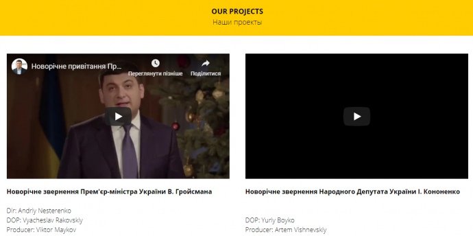 Також з сайту видно, що останнім часом компанія має інших замовників серед політиків. Два останніх відео у розділі – новорічні привітання Володимира Гройсмана та Ігоря Кононенка. Щоправда, ролик з Кононенком з Youtube-каналу «Goodmedia» видалили.