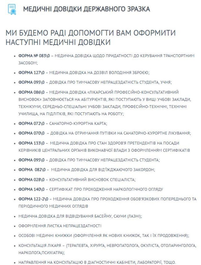 Зокрема, за 300, 400 чи 500 гривень на спеціальному сайті Spravka можна придбати медичні довідки щодо тимчасової непрацездатності, придатності до водіння, для дозволу з отримання зброї, сертифікати про проходження медогляду, медичні книжки тощо.