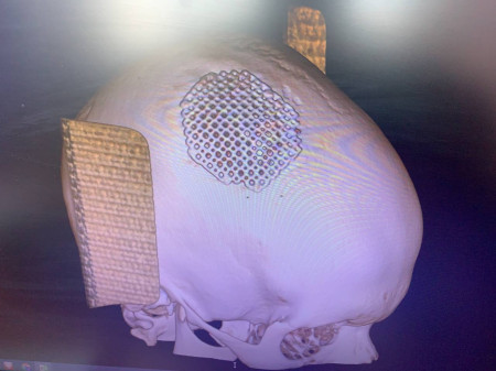 Пошкоджену частину черепної коробки закрили спеціальною титановою пластиною, яка повторює кісткові структури черепа, захищає мозок від ушкоджень.