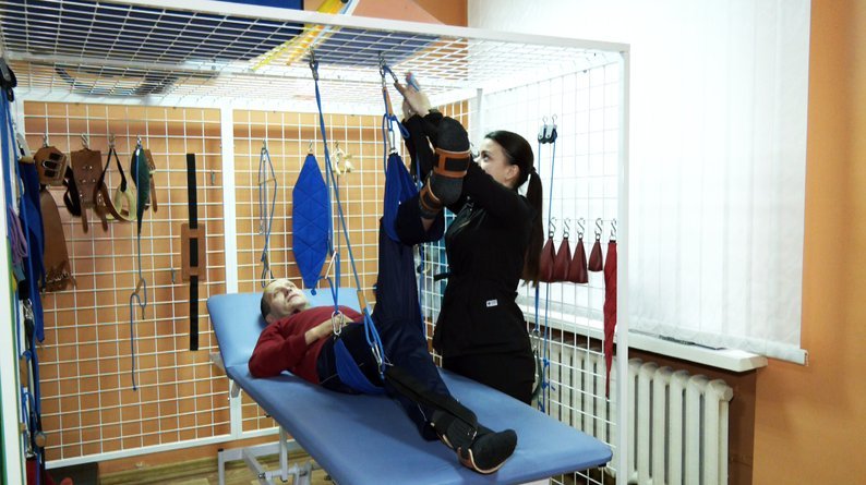 Один із методів фізичної терапії, який застосовують у госпіталі ветеранів війни, – кінезотерапія, зокрема підвісна кабіна, за допомогою якої можна розвантажити різні групи м’язів, позбавити напруження або ж ефективно навантажити їх, розповідає фізична терапевтка Оксана Гречко.Військовий 14-ї ОМБР Петро Підвальний каже: завдяки цій процедурі почувається краще і вже ходить без милиць.