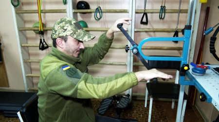 Військовий 104-ї бригади територіальної оборони Валерій Мисюк відновлюється після поранення, яке отримав у березні 2023 року. Вже другий місяць чоловік на реабілітації, тренується у залі фізичної терапії.Механотерапія – метод фізичної реабілітації, який допомагає відновити функції, зміцнити м’язи, збільшити амплітуду рухів верхніх кінцівок, розповідає асистентка фізичного терапевта Мар’яна Навроцька.