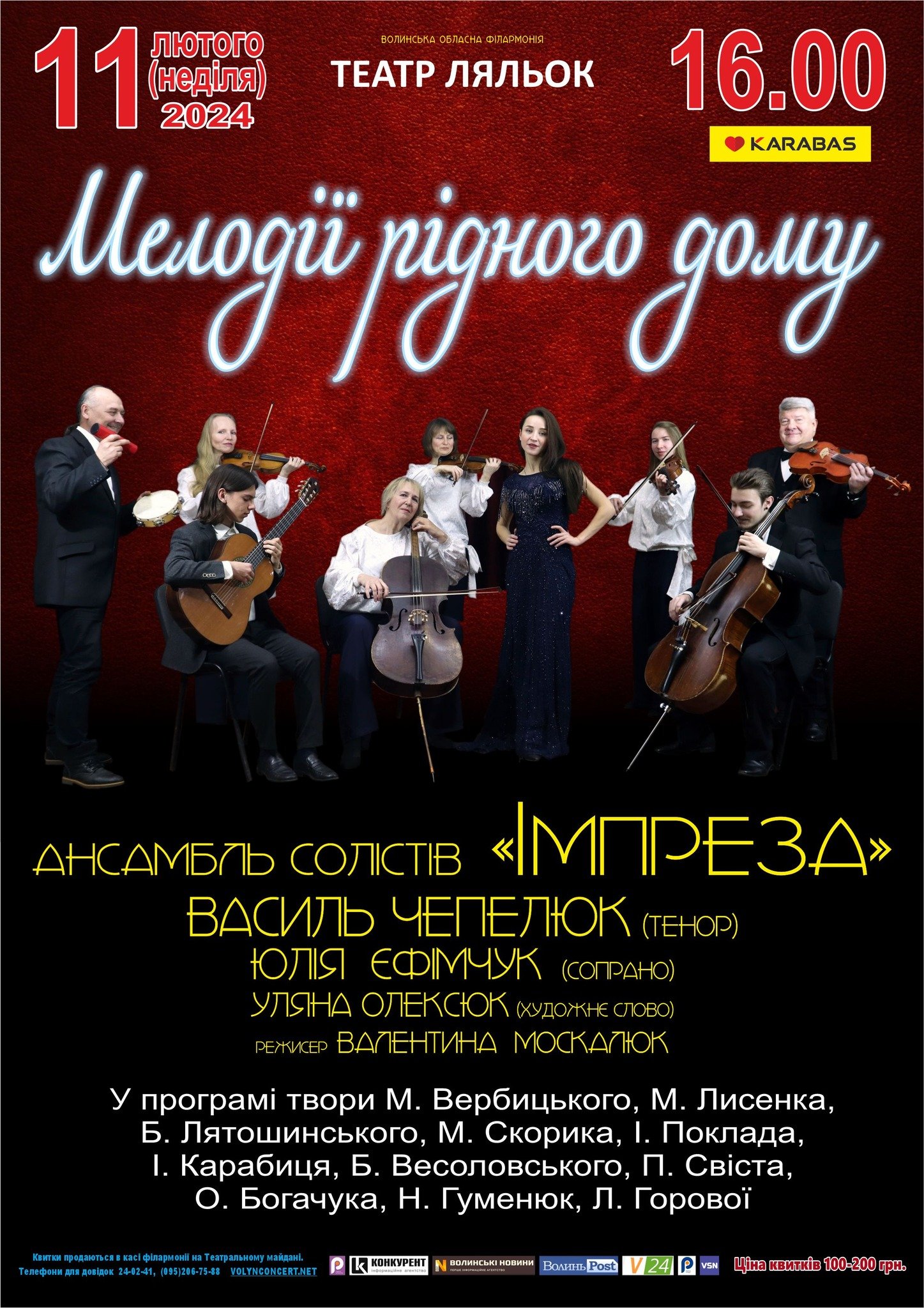 11 лютого о 16:00 у Волинському академічному обласному театрі ляльок відбудеться концерт «Мелодії рідного дому». Ліричні пісні, чудову музику і натхненні поетичні рядки даруватимуть народний артист України Василь Чепелюк та найкращі артисти Волинської обласної філармонії – Юлія Єфімчук (сопрано), інструментальний ансамбль «Імпреза» (керівник Юрій Ковальчук) та ведуча Уляна Олексюк.