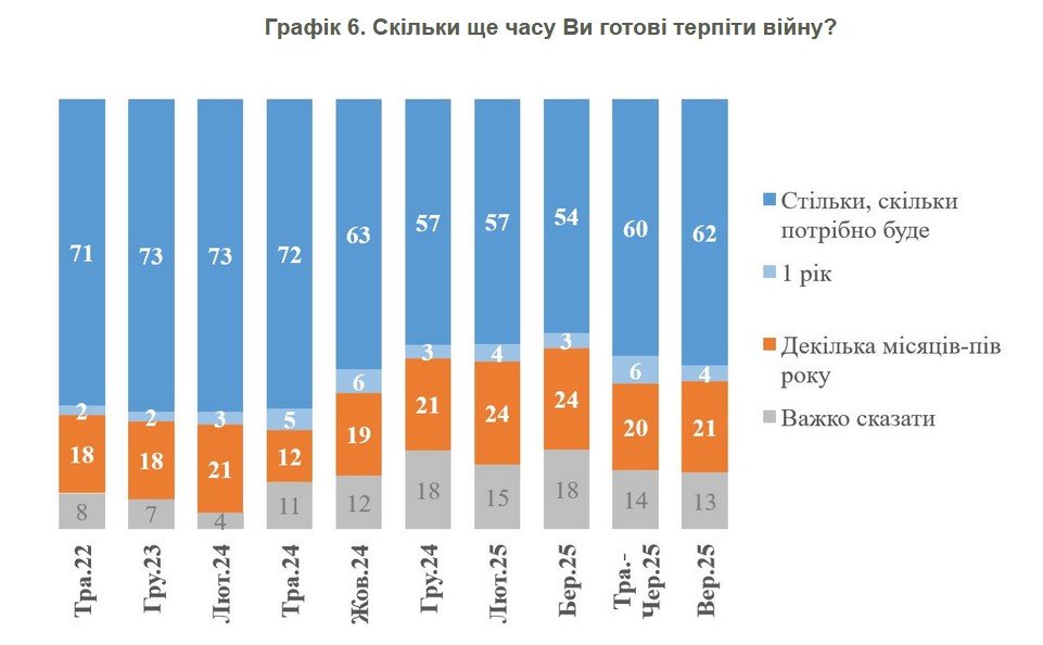 При цьому більшість українців (62%) продовжують відповідати, що вони готові терпіти війну стільки, скільки потрібно (на початку червня 2025 року показники були ідентичні). Ще 4% відповіли, що готові терпіти близько року.