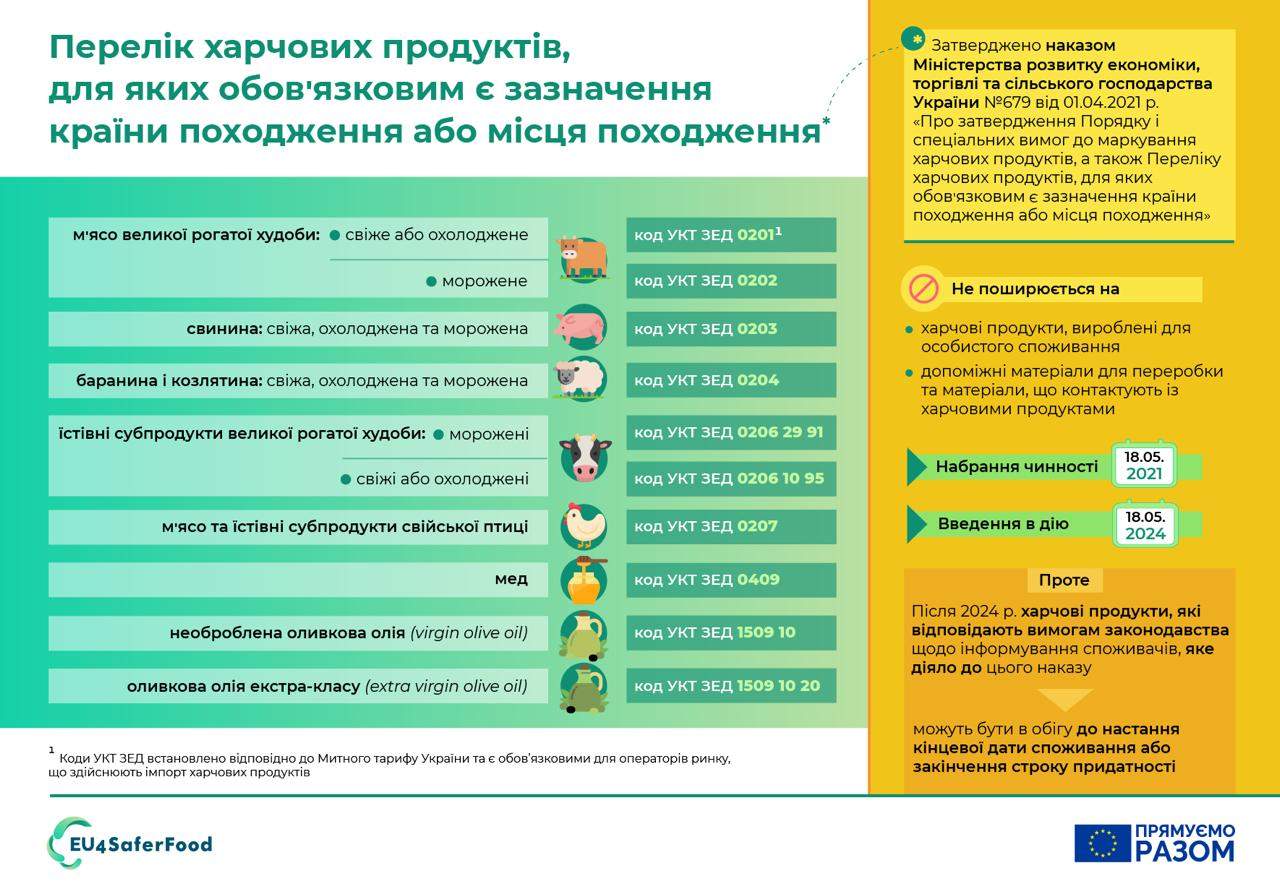 Для кращого розуміння бізнес-середовищем України планованих нововведень представники проєкту ЄС EU4SaferFood, який допомагає Україні вдосконалити систему контролю у сфері безпечності харчових продуктів, здоров’я та благополуччя тварин, підготували інфографіку переліку харчових продуктів, для яких обов’язковим є зазначення країни походження або місця походження.