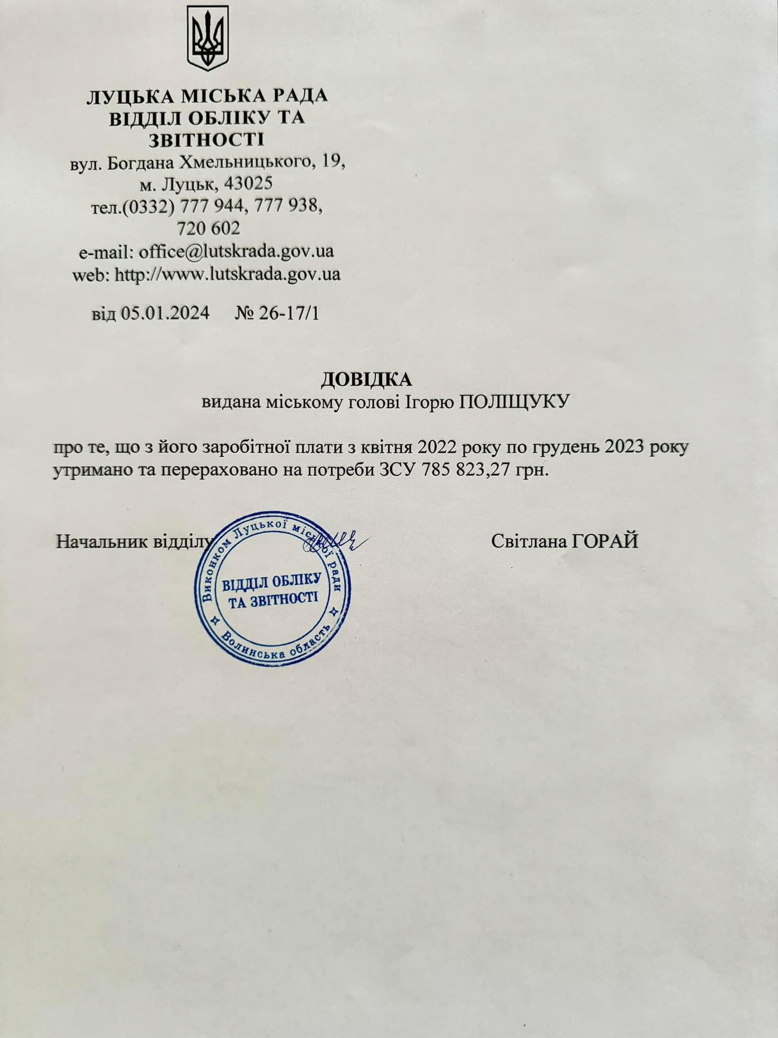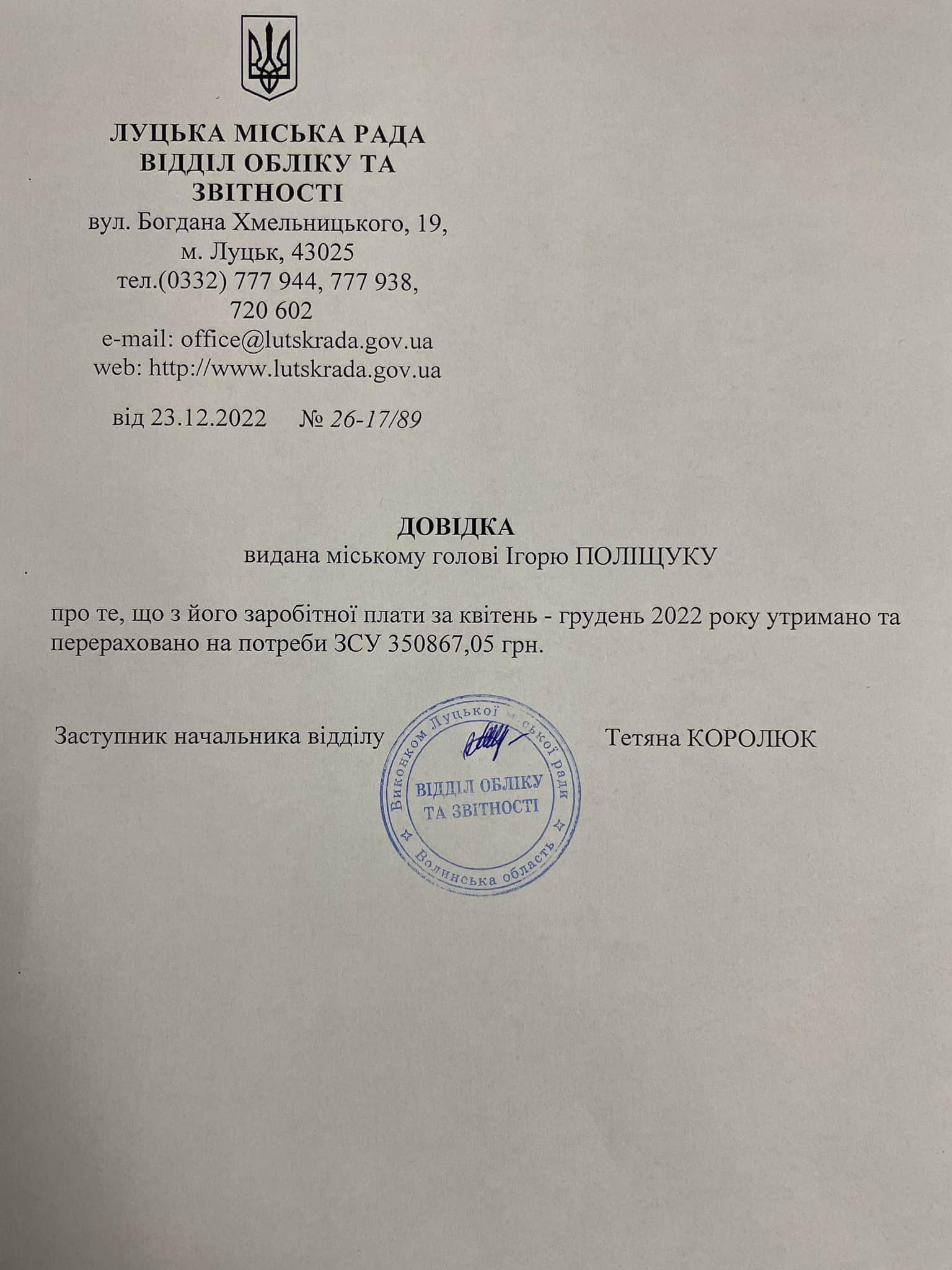 При цьому журналісти видання не вказали, що за 2022 рік Ігор Поліщук перерахував на ЗСУ із цієї ж зарплати понад 350 тисяч гривень.