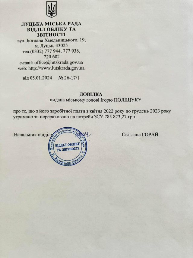 Мер Луцька з початку повномасштабної війни з РФ переказав на ЗСУ близько 850 тисяч