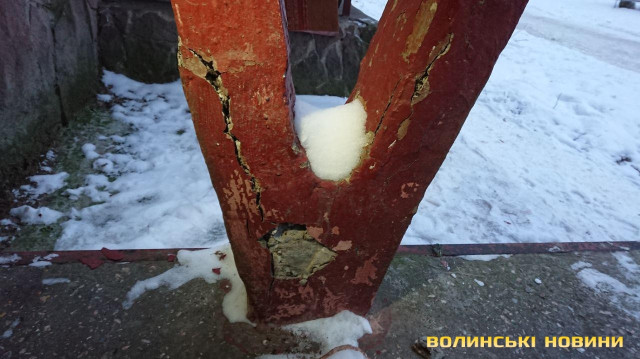 «Терміново! Руйнування опори даху над входом у під'їзд. Після попереднього звернення щодо небезпечної ситуації, ЖЕКом було проведено косметичний ремонт стійки. Підштукатурили та пофарбували. Однак стійка продовжує дуже швидко руйнуватися, що незабаром призведе до падіння бетонного даху», - пише Василь Іванюк.