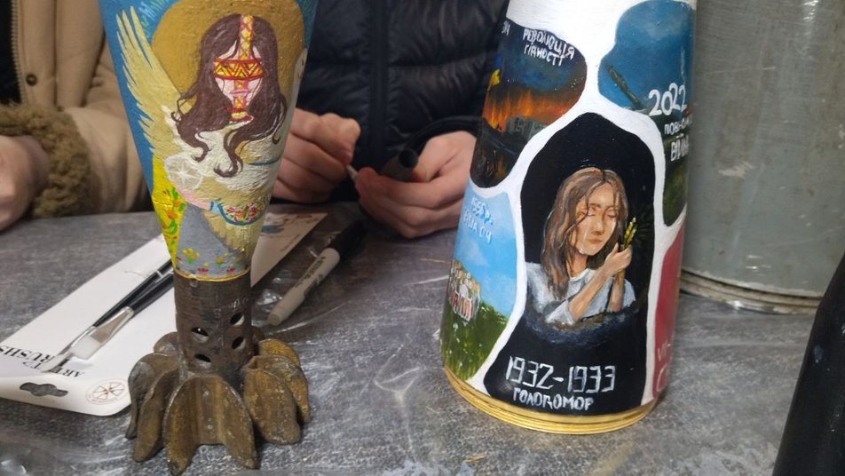 Завершила оформлювати фарбами фрагмент тубуса від снаряда 16-річна Софія Лукашук. На частині від боєприпаса дівчина зобразила українського захисника: «Нашого солдата, який помер від слів Слава Україні! Написала цитату Тараса Шевченка про Україну».Як розповіла місцева волонтерка Віра Шварцкоп, розфарбовані гільзи та уламки ракет дарують іноземцям-волонтерам.
