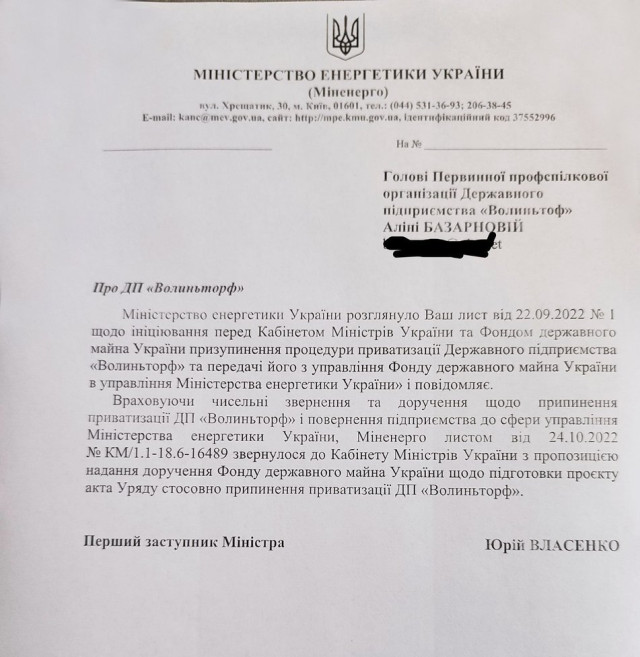 Міністерство Енергетики України ініціює припинення процедури приватизації державного підприємства «Волиньторф».