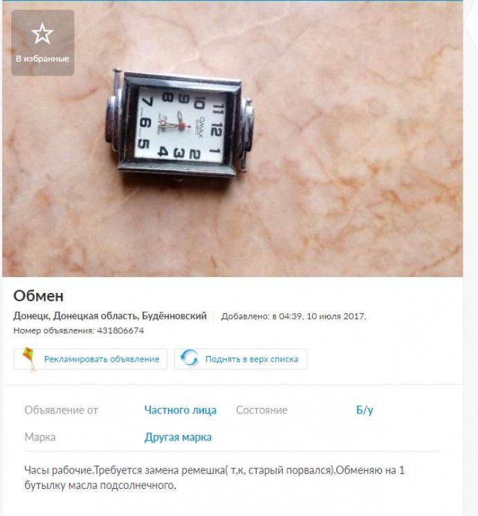 На популярному сайті безкоштовних оголошень є розділ з обміном. Українці зазвичай обмінюються там дитячим одягом чи речами, які не підійшли за розміром. Колекціонери міняються іграшками з "кіндер-срюпризу", аксесуарами, косметикою, парфумами і посудом.