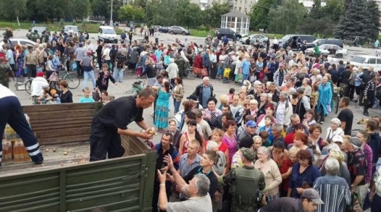 На деокупованих частинах Донбасу жити також непросто, але принаймні там волонтери привозять одяг і харчі, та й військові допомагають. От фото із звільненого від терористів Слов'янська - українські "карателі" роздають містянам їжу.