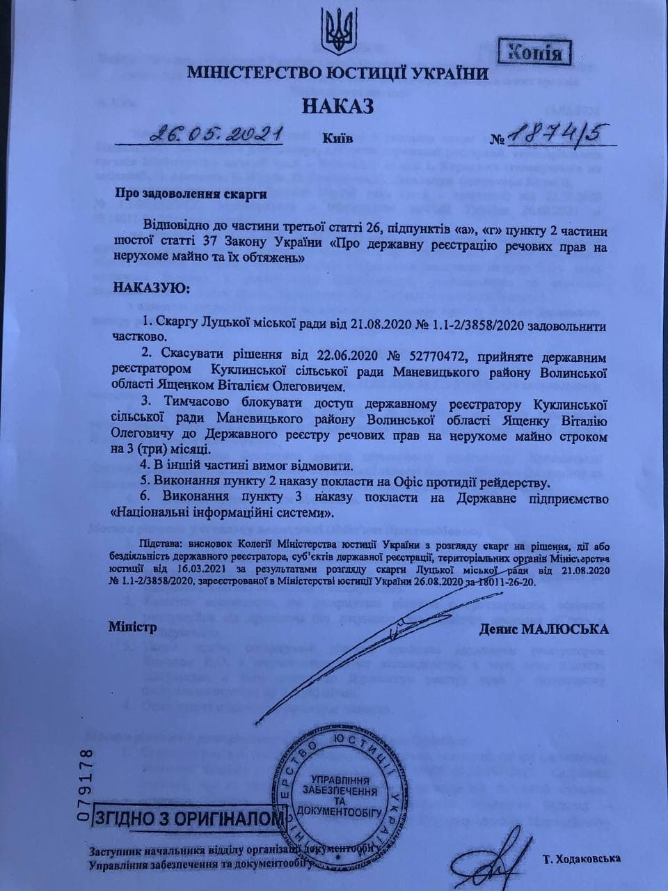 Міністр юстиції України Денис Малюська у відповідь на скаргу Луцької міської ради скасував рішення скандального «чорного реєстратора» щодо реєстрації права власності на житловий будинок з приміщеннями на проспекті Відродження, 29а.