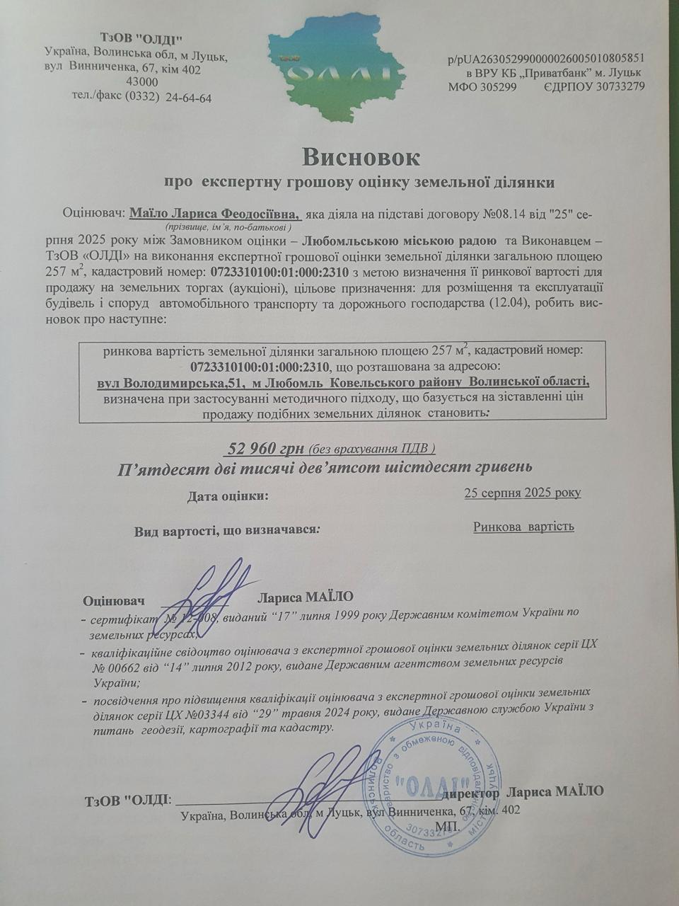 - земельна ділянка несільськогосподарського призначення площею 0,0257 га, кадастровий номер – 0723310100:01:000:2310, що розташована за адресою: Волинська область, Ковельський район, Любомль, вулиця Володимирська, 51; на ділянці доступне електропостачання;