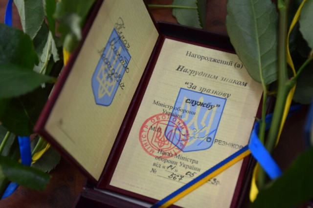 Нагрудним знаком «За зразкову службу» нагороджено солдата Пугача Михайла Леонідовича (посмертно). Нагрудний знак отримав батько Леонід Михайлович.