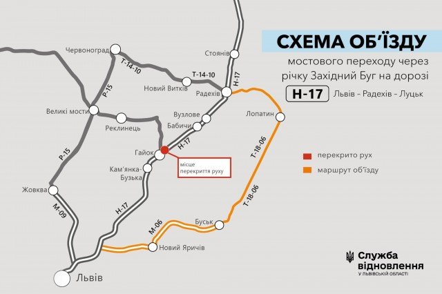 Схема об’їзду мостового переходу через річку Західний Буг на дорозі Н-17 Львів – Радехів – Луцьк для транспорту: