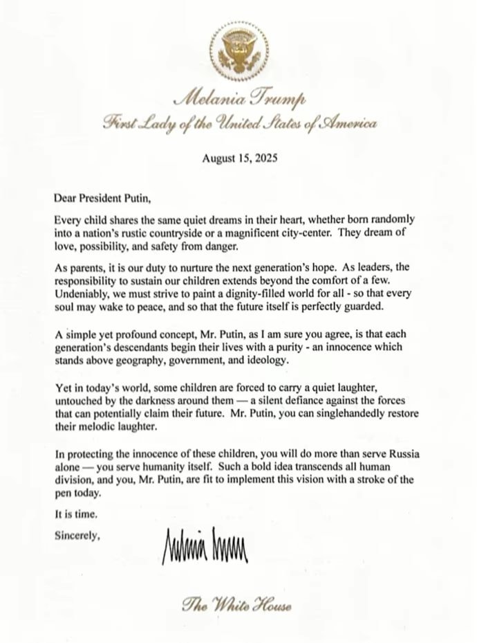 Американське видання Fox News оприлюднило копію листа, який перша леді США Меланія Трамп передала російському правителю Володимиру Путіну через свого чоловіка, президента Дональда Трампа. У посланні вона закликала російського президента «захищати дітей» і долати поділи між народами.