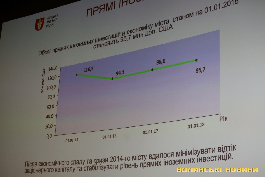 У місті переважає переробна та машинобудівна промисловість, виробництво транспортних засобів та устаткування, зокрема, йдеться про підприємство світового лідера у виробництві підшипників, концерну «SKF». Перший заступник міського голови відзначив, що місто розвивається, попри те що досі лишається затиснутим у своїх межах: у 2017 році прийняли в експлуатацію понад 79 тисяч метрів квадратних житла.Григорій Недопад відзначив, що після кризи 2014 року вдалося мінімізувати відтік інвестиційного капіталу. Так, обсяг прямих іноземних інвестицій в економіку міста перевищує 95 мільйонів доларів. Луцьк є учасником проекту Європейського інвестиційного банку щодо закупівлі 30 нових тролейбусів за кошти банку та міського бюджету.