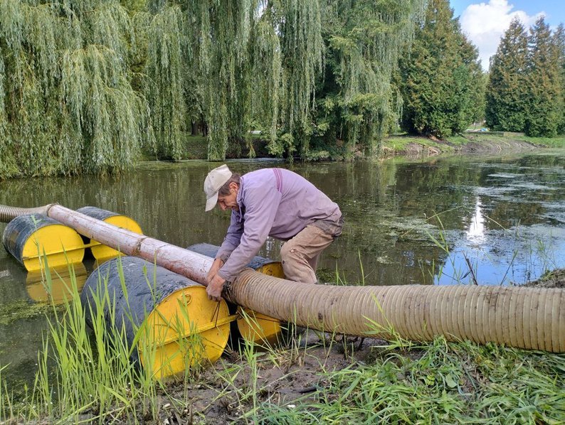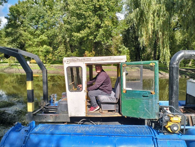 Як розповів Суспільному оператор земсняряда приватної фірми, яка виграла тендер на проведення робіт, Юрій Коробко, водойма, на якій працює машина-амфібія, замулюється через опале листя.