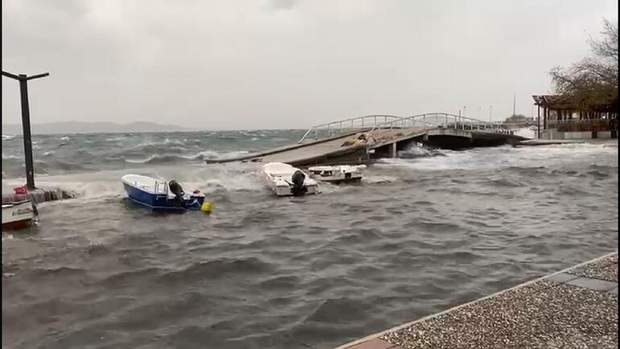 У районі Каршіака в Ізмірі, третьому за величиною місті країни на узбережжі Егейського моря, сильний вітер створив великі хвилі, затопивши дорогу вздовж берега моря та трамвайну лінію.