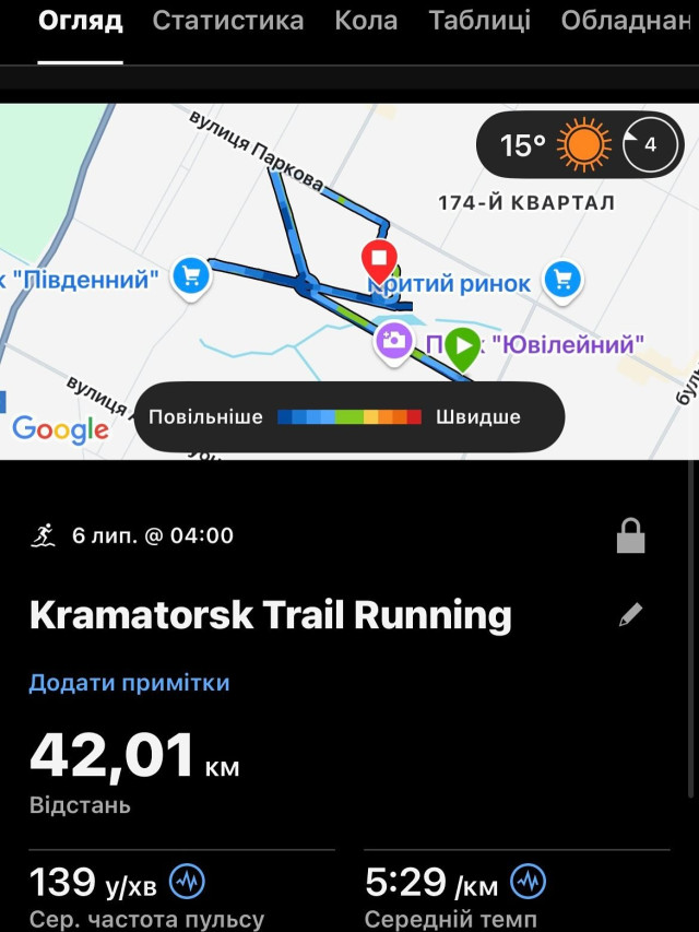 Однак думка про те, що насправді я точно можу набагато більше, мене не полишала. Знаю, що і 100 зможу пробігти, просто треба підготуватися.І от ніч на 6 липня. Перед тим я тиждень готувався, найперше морально. Так і не зміг тоді заснути, бо оформляли якогось п’яного й дзвонили мені, потім комар над вухом дзижчав, падлюка. Я встав о 3:00. Набрав води, заколотив собі з медом, сіллю, лимоном. Стартував о 4:00 і просто біг 3 години і 47 хвилин. І це був концентрований кайф. Відчував, що міг би тоді і 50 кілометрів пробігти, але оскільки не спав, розумів, що можу перестаратися. Та й рівно на 40-му кілометрі розрядилися навушники. А біжу я тільки з музикою – люблю саме так.