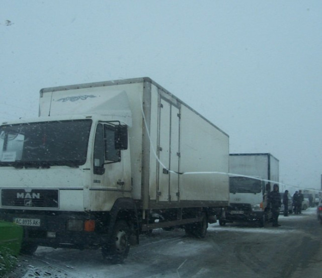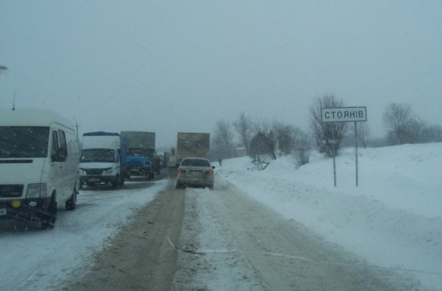 На кордоні між Львівською і Волинською областями біля села Журавники по обидві сторони узбіччя стоять близько 40 вантажівок. Фури не можуть проїхати через негоду – дорогу занесло снігом.