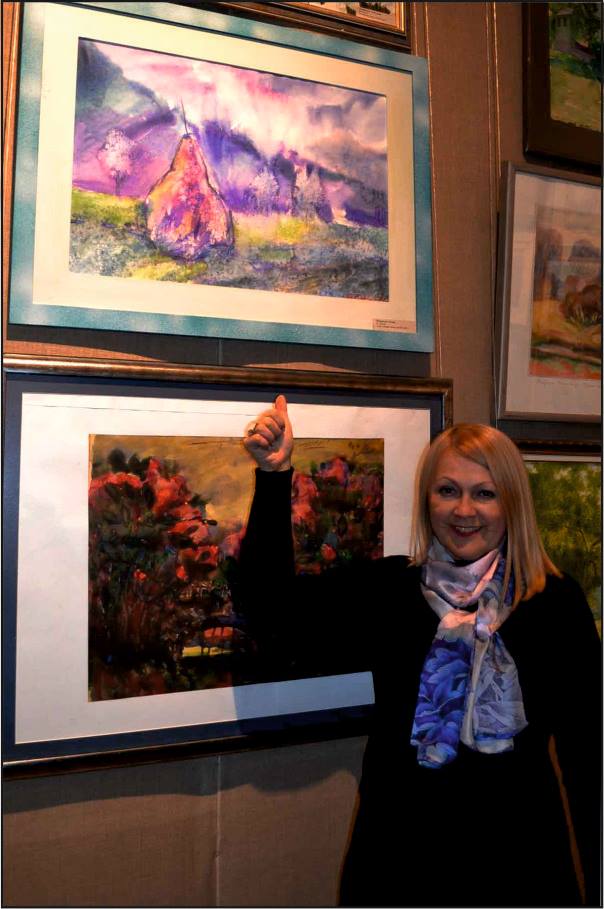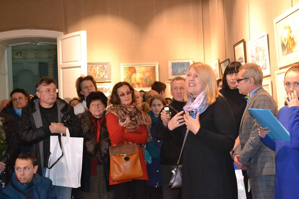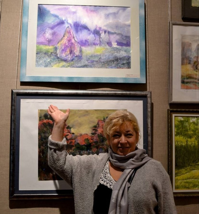 експозиційному ряду серед робіт кращих художників України, а також колег з Китаю, Італії, Латвії, Туреччини, США та інших країн. Волинські мистці також взяли участь в церемонії відкриття виставки «Море акварелі-2018», мали можливість поспілкуватися з організаторами, кураторами, учасниками події й численними шанувальниками акварельного живопису.Олена Журавель біля своєї роботи